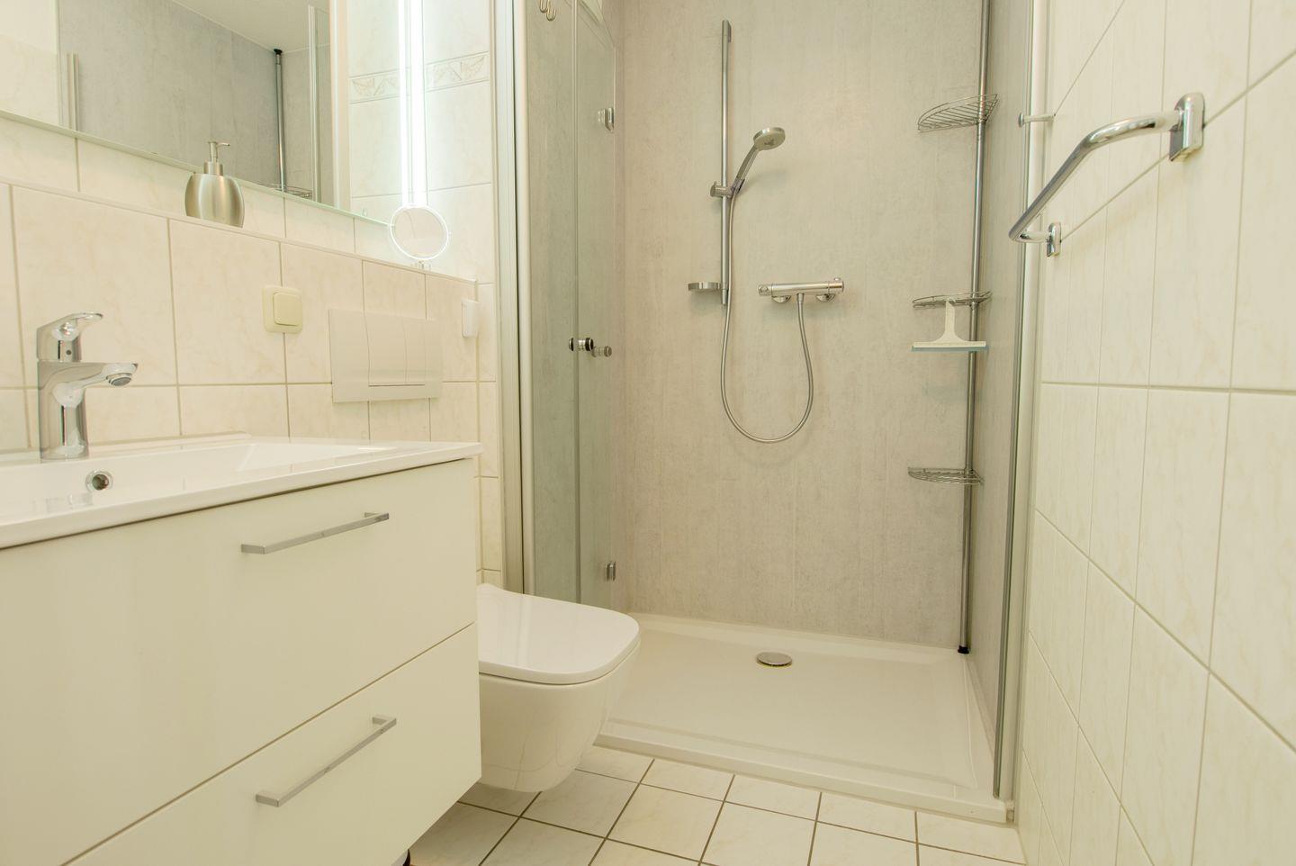 Ihre Urlaubsresidenz verfügt über ein Schlafzimmer mit extra großem Einbau-Wandschrank, (seit 2025 gehört zum Schlafzimmer ein Boxspringbett in der Größe 160 x 200 cm), 1 Duschbad mit bodengleicher und sehr geräumiger Dusche mit Echtglasduschabtrennung und 1 Wohnzimmer mit komplett ausgestatteter Küche, welche keine Wünsche offen lässt.