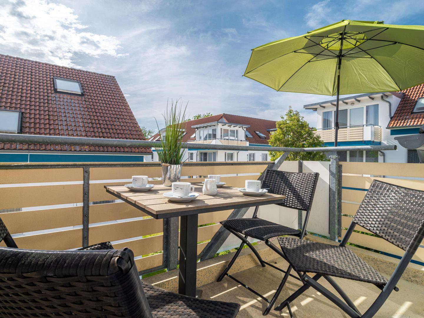 Moderne Ferienwohnung in erster Reihe am Strand von Zingst mit Balkon, Sauna und Whirlpool, ideal für Familien und Aktivurlauber.