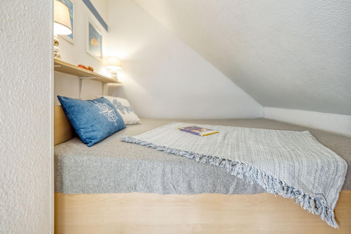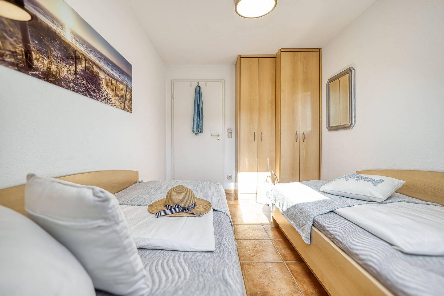 Die Ferienwohnung bietet auf der ersten Ebene zwei getrennte Schlafzimmer, ausgestattet mit einem Doppelbett und zwei separaten Einzelbetten sowie ein Badezimmer mit Dusche und WC.