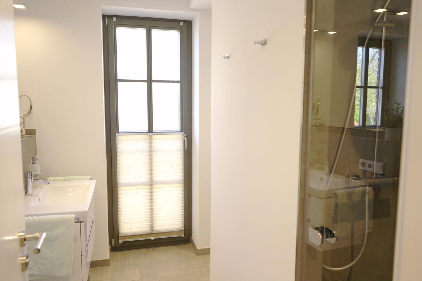 Das Badezimmer hat eine bodengleiche Dusche, zur Unterhaltung steht Ihnen am Badezimmerspiegel ein in der Wand integrierten Radio bereit.