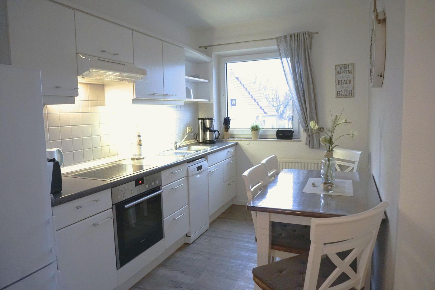 Die offene Küche ist vollständig ausgestattet und lässt keine Wünsche offen – ideal für gemeinsames Kochen und Genießen am Esstisch für vier Personen. WLAN, Waschmaschine und Wärmepumpentrockner gehören ebenfalls zur Ausstattung.