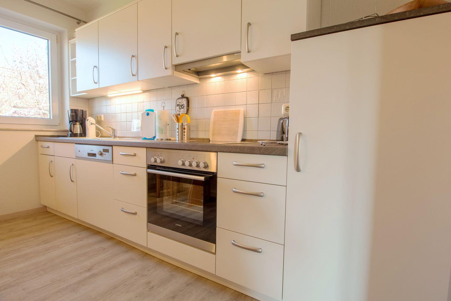Der offene Wohnbereich mit Essplatz und integrierter Küchenzeile lädt zum Verweilen ein. In der voll ausgestatteten Küchenzeile finden Sie alles, was Sie für Ihre Urlaubsverpflegung benötigen. Der großzügige Westbalkon, möbliert mit bequemen Gartenmöbeln und Sonnenschirm, ist der perfekte Ort, um den Tag entspannt ausklingen zu lassen.