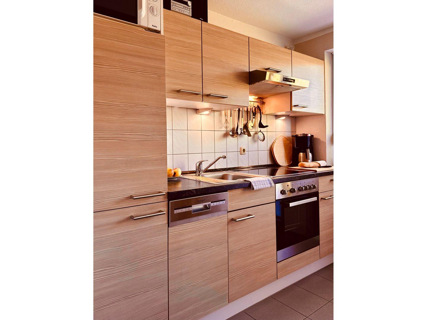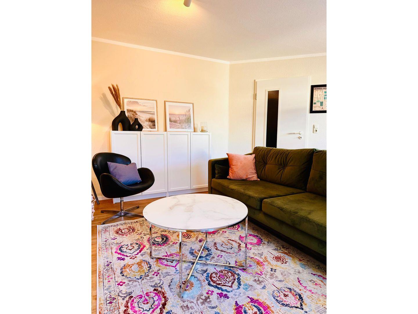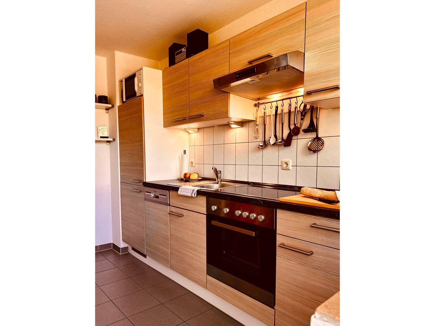 Der geräumige Wohnbereich mit ausreichend Sitzmöglichkeiten für bis zu 4 Personen geht direkt in die Essecke und die offene Küchenzeile über, diese ist modern und umfangreich ausgestattet. Hier befindet sich auch der Zugang zum möblierten Westbalkon.