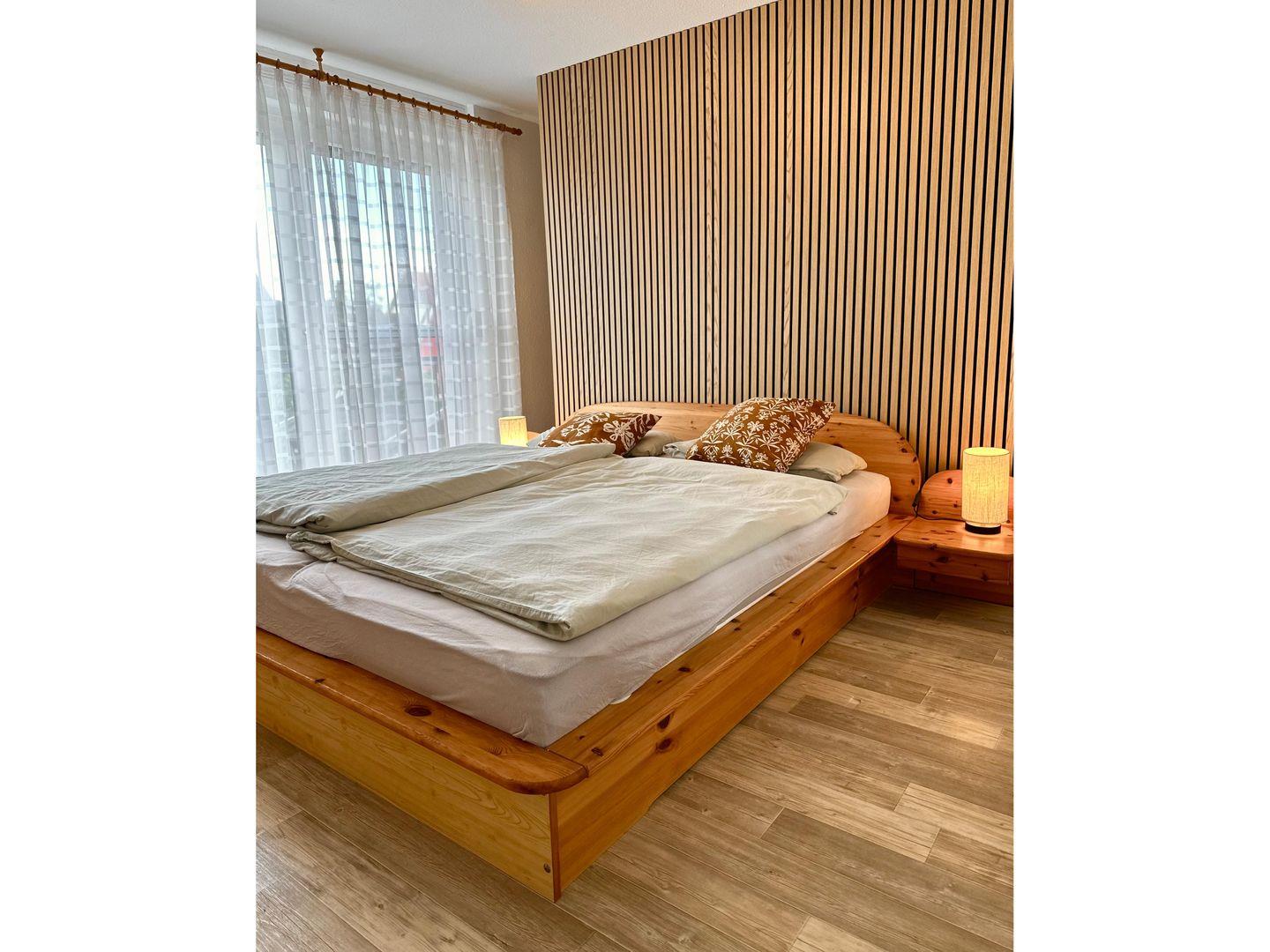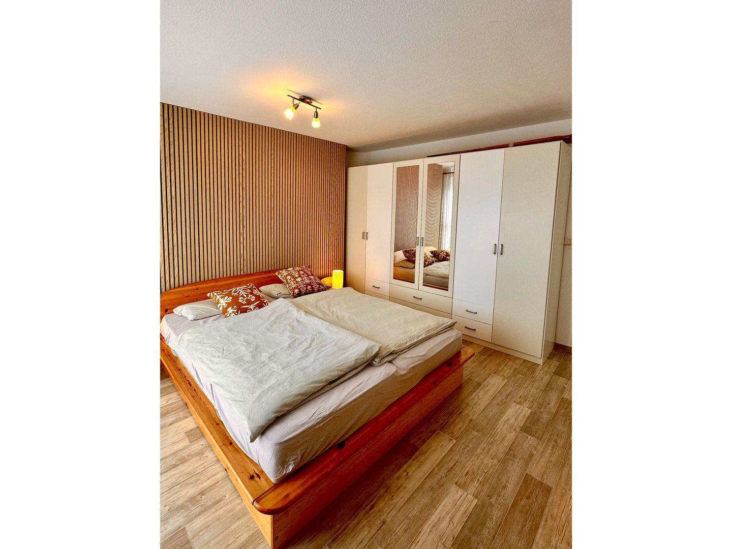 Die beiden Schlafzimmer verfügen über bodentiefe Fenster und jeweils ein Doppelbett sowie einen großen Kleiderschrank. Durch die Außenrollos lassen sich die Räume sehr gut abdunkeln.