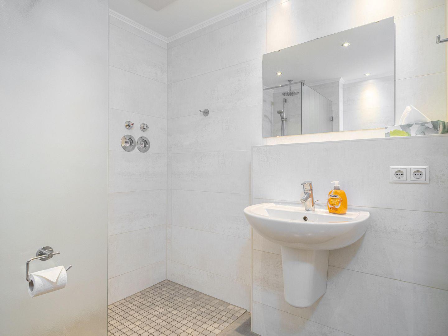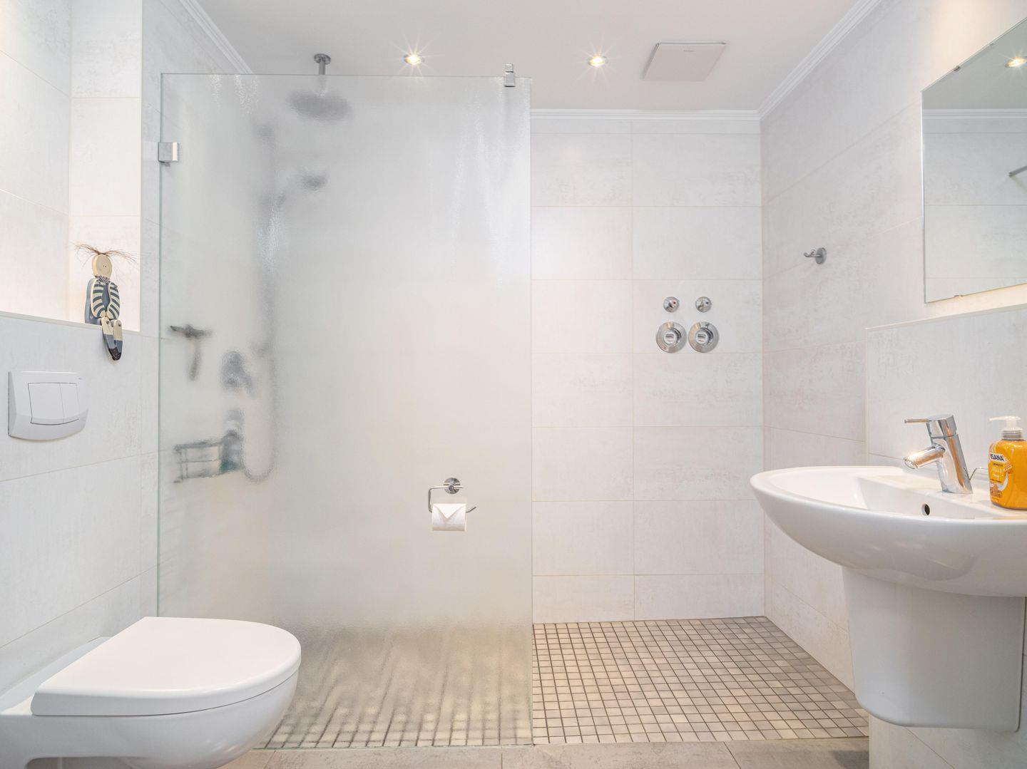 Das große Badezimmer ist mit einer ebenerdigen Dusche versehen.