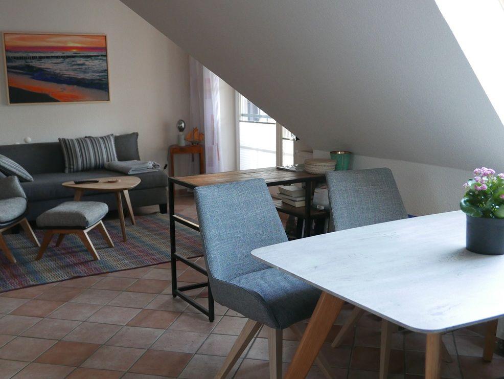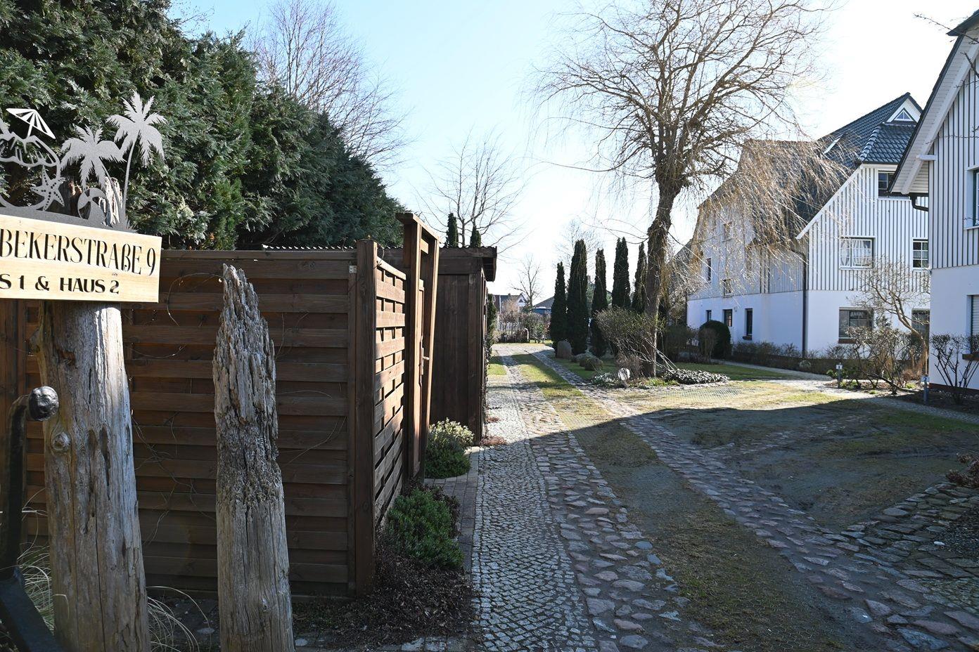 Die 54 m² große Ferienwohnung liegt in einer gepflegten Eigentumsanlage im 2. Stock (Dachgeschoss) des vorderen, in norddeutschem Stil gebauten Gebäudes mit holzverkleidetem Giebel und Holzfenstern.