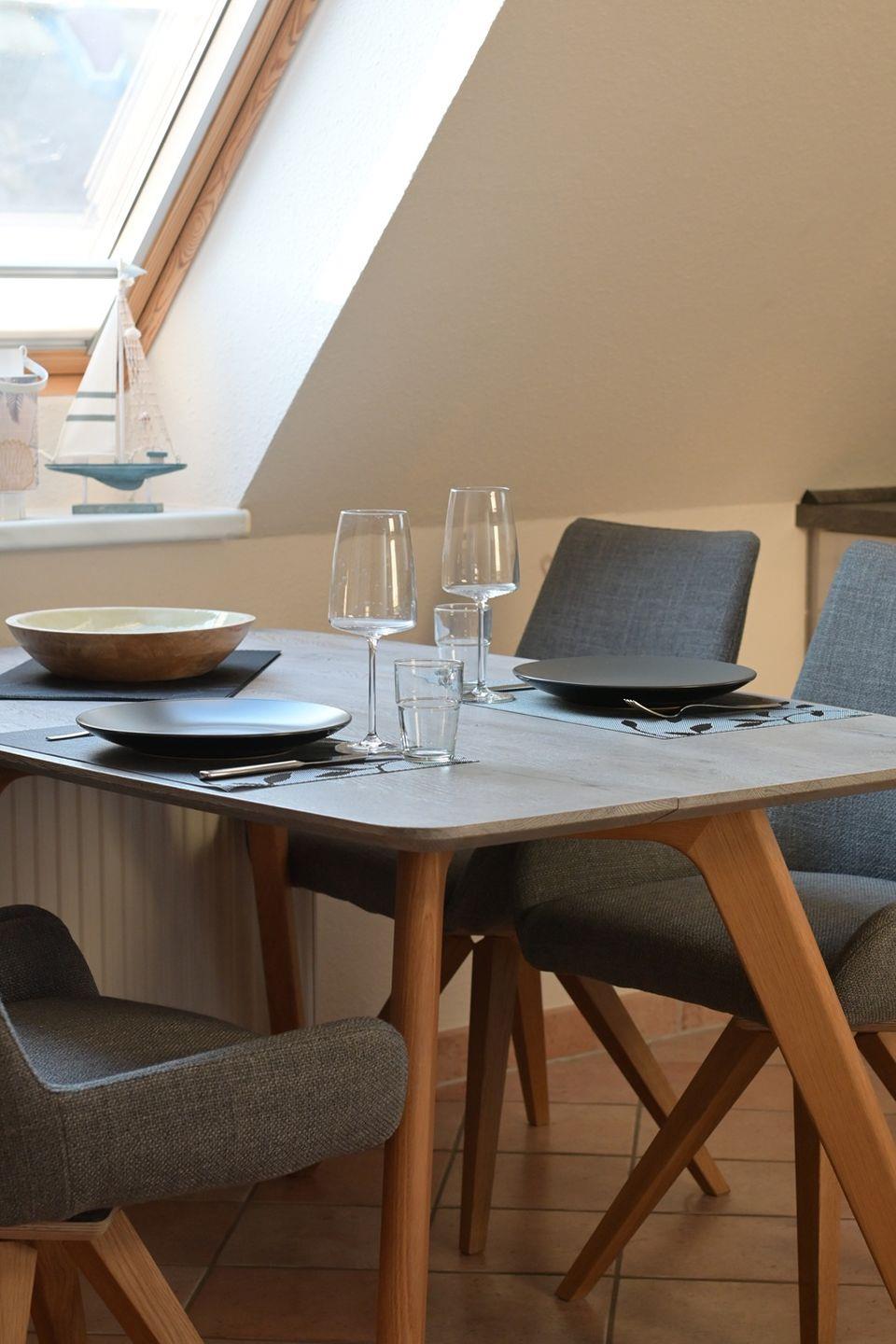 Der Essbereich mit modernem, bequemem Mobiliar bietet Platz für 2 Personen. An einem separaten, kleineren Schreibtisch können gelegentliche Arbeiten erledigt werden.
