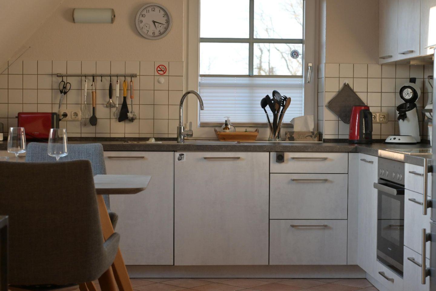 Die offene Küche mit angegliedertem Wohnbereich bietet alle Bequemlichkeiten für Kurz- und Langzeitgäste. Sie verfügt über einen Herd mit Cerankochfeld, einen Backofen, eine Geschirrspülmaschine und einen großen Kühlschrank mit Gefrierteil sowie zahlreiche elektrische Küchenhelfer.