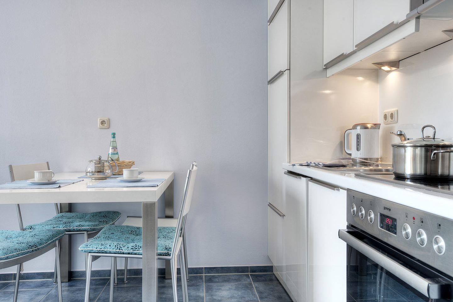 Die zeitgemäße Küche ist offen zum Wohnzimmer angelegt und überzeugt mit einer umfassenden Ausstattung. Zu den Annehmlichkeiten zählen ein Ceranherd, Backofen, Spülmaschine, Kühlschrank mit integriertem Gefrierfach, Mikrowelle, Wasserkocher, Toaster, Eierkocher, Kaffeemaschine sowie vielfältige Küchenutensilien, Geschirr und Besteck. Ein Esstisch verbindet die Bereiche und lädt zu gemeinsamen Mahlzeiten ein.