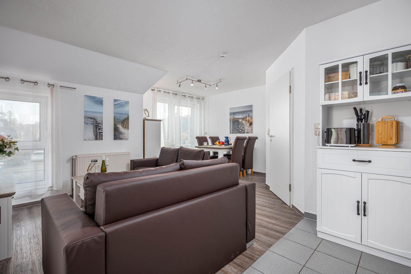 Der Wohnbereich ist offen und freundlich gestaltet. Im Wohnzimmer mit Laminatboden stehen Ihnen eine Sofaecke, ein Sofa, ein Esstisch sowie ein TV, Radio und CD-Spieler zur Verfügung. WLAN und Internet sorgen auch während Ihres Aufenthalts für eine komfortable Verbindung. Die offene Küche ist direkt in den Wohnbereich integriert und ermöglicht kurze Wege im Alltag. Sie ist mit Cerankochfeld, Backofen, Kühlschrank, Spülmaschine, Mikrowelle, Kaffeemaschine, Toaster, Wasserkocher, Mixer sowie Küchenutensilien, Geschirr, Besteck und Geschirrhandtüchern umfassend ausgestattet.