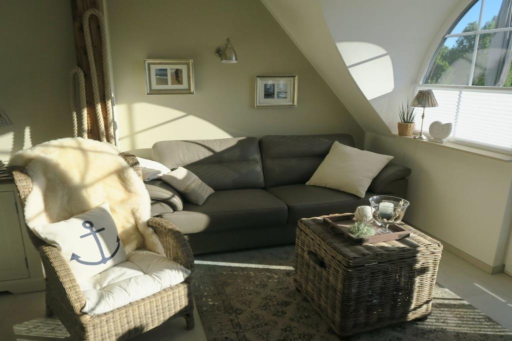 Ihr Urlaub liegt uns am Herzen. Ankommen, Wohlfühlen, Entspannen. Genießen Sie unsere lichtdurchflutete, elegante 5 Sterne-Ferienwohnung mit Fußbodenheizung und mondernstem Komfort in heller freundlicher Ausstattung für 2 Personen, in fußläufiger Nähe zum Strand und zum Ortskern. Mittelpunkt der süd-/westlich ausgerichteten Ferienwohnung im Obergeschoss ist ein großzügiger Wohn-/Essbereich im maritimen Flair mit einer modernen, voll ausgestatteten Markenküche. Im gemütlichen Schlafzimmer mit einem komfortablen Doppelbett (1,80 x 2,00) können sie sich von einem ausgiebigen Strandtag bei geruhsamem Schlaf erholen. Das Bad lässt mit einem großzügigen Designerwaschtisch, ebenerdiger Dusche mit Regenschauer- und Handbrause sowie Handtuchheizkörper keine Wünsche offen. Weiterhin verfügt die Ferienwohnung über 2 eigene Balkone, von denen sich die Mittags- und Abendsonne genießen lässt.