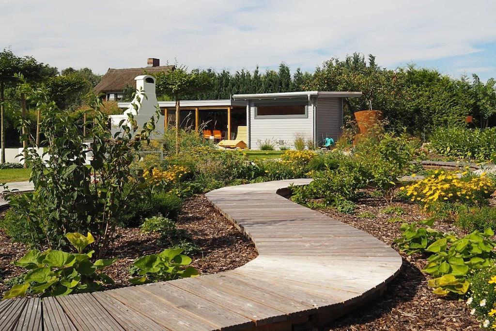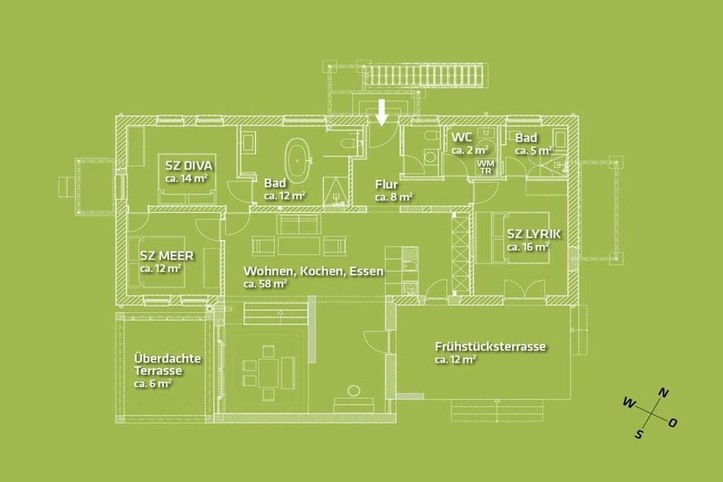Erdgeschosswohnung in designorientiertem Architektenhaus in Zingst. Zu der Ferienwohnung gehören 2 Terrassen, großer Wohn- Essbereich, Klavier, Kamin, 3 Schlafzimmern, 2 Bädern, 1 Gästebad. Die Erdgeschosswohnung hat einen eigenen Gartenbereich mit 2 Terrassen und einen großen Garten zur Mitbenutzung. Hier befindet sich der Zentrale Grillplatz und die Außensauna.