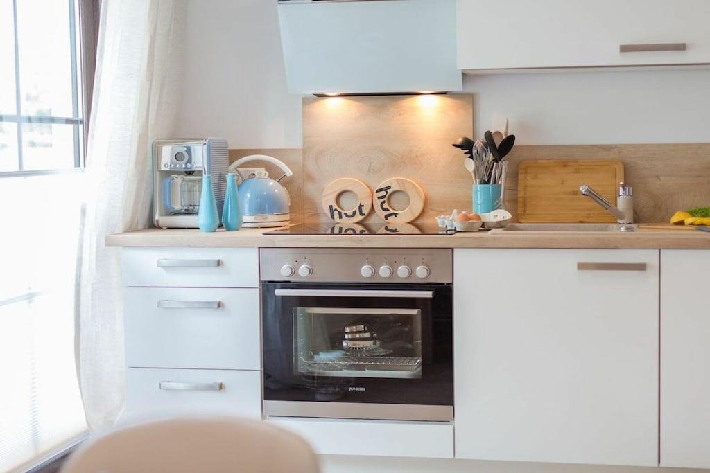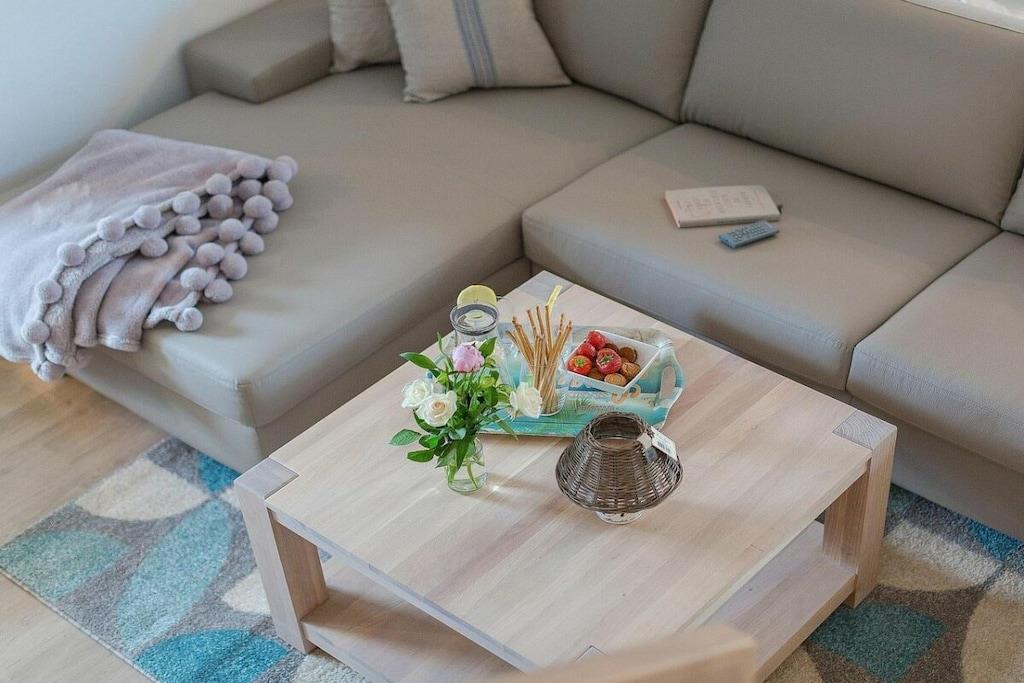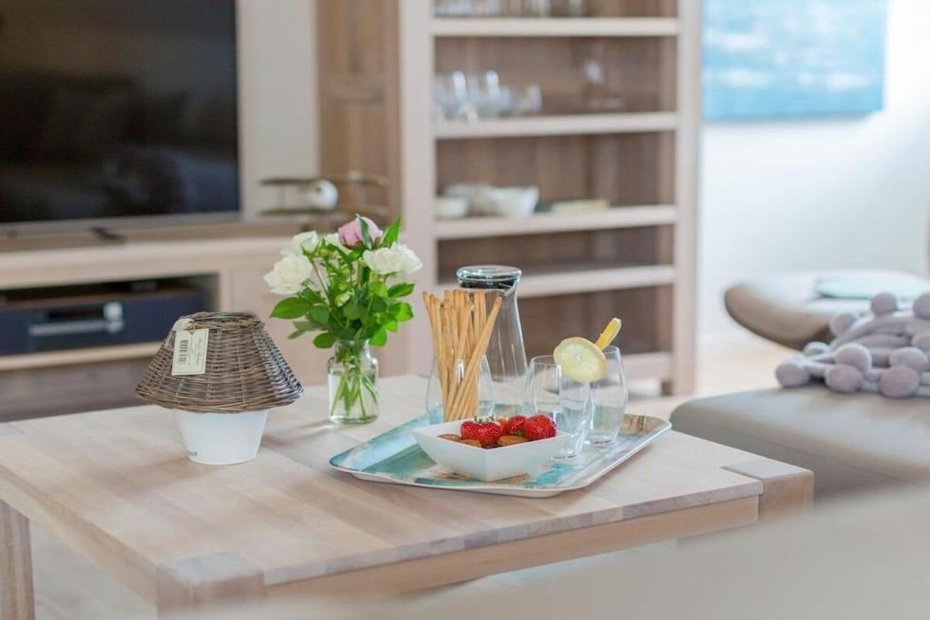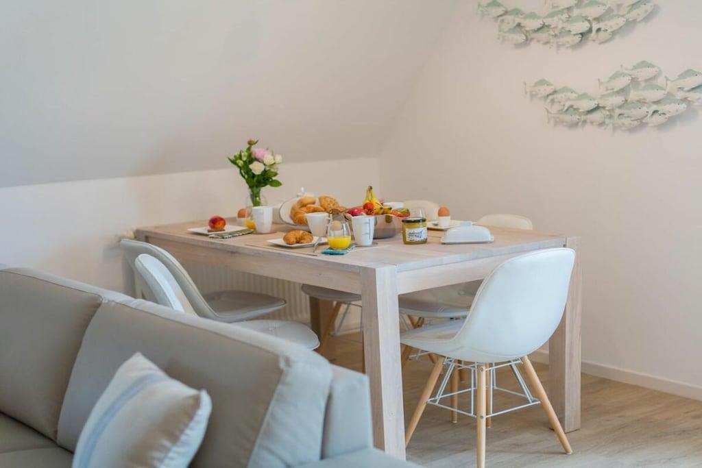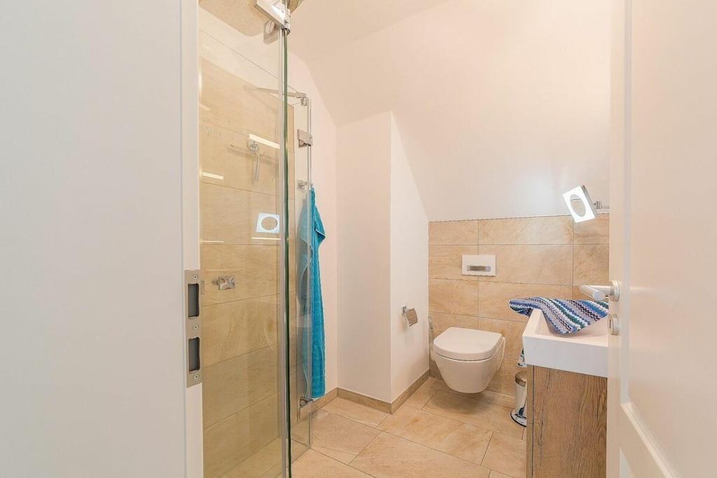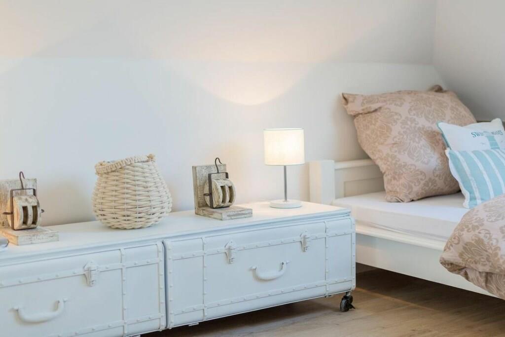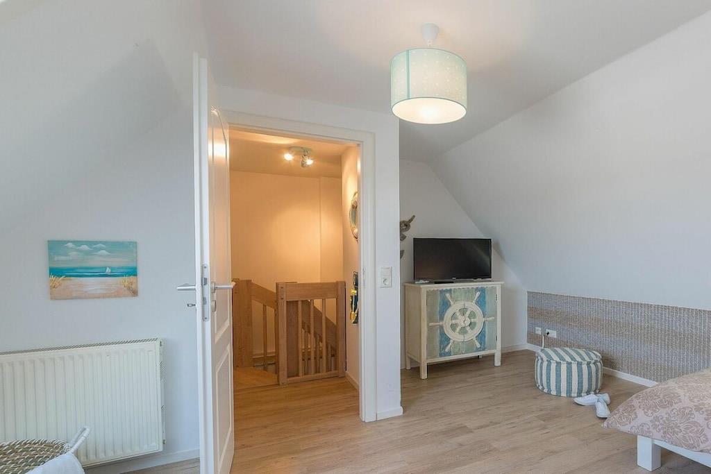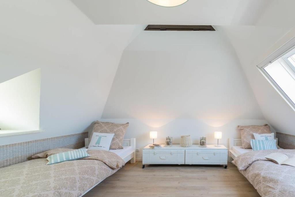 Ihre Ferienwohnung hat eine Größe von 66 m² und ist eine Maisonettewohnung mit großem Balkon, 2 Schlafzimmern, einem Badezimmer und einem großes Wohn/Esszimmer mit Küche. Im Flur können Sie Ihre Garderobe anhängen. Das moderne Badezimmer verfügt über eine ebenerdige Dusche und Fußbodenheizung. In diesem sehr schicken Mehrfamilienhaus, mit 5 Wohneinheiten befindet sich im Abstellraum eine Waschmaschine, die gegen Gebühr genutzt werden kann. Im Elternschlafzimmer befindet sich ein Boxspringbett, für traumhaften Schlafkomfort und im Kinderzimmer finden Sie zwei Einzelbetten 90x200. Eine Aufbettungsmöglichkeit haben Sie im Wohnzimmer, hier können Sie die Hotelaufbettung von 160x200m mit Matratze nutzen. Die Sauna steht Ihnen im Garten zur Verfügung und kostet 5,- je halbe Stunde.