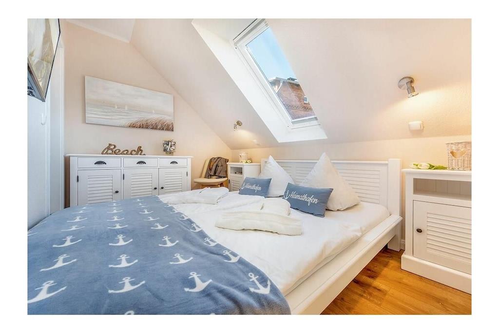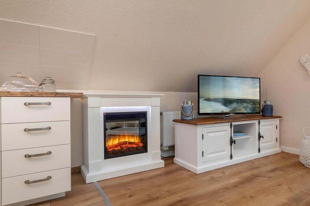 Diese schöne Ferienwohnung liegt sehr zentral, Bäcker, Restaurants und Strand befinden sich gleich um die Ecke. Das helle sehr großzügige Wohn/Esszimmer bietet Platz für bis zu 6 Personen, eigene Sauna, gemütlicher Kamin (elektr.) mit schön ausstrahlender Wärme und Platz. Die Ferienwohnung Seebrise verfügt über 2 Schlafzimmer mit jeweils einem Doppelbett. Im Wohnzimmer kann man sogar die Couch in ein zusätzliches Doppelbett von 160x200m verwandeln. Die gesamte Einrichtung ist hell, freundlich und maritim. Im Schlafzimmer 2 befindet sich ein weiterer Fernseher.