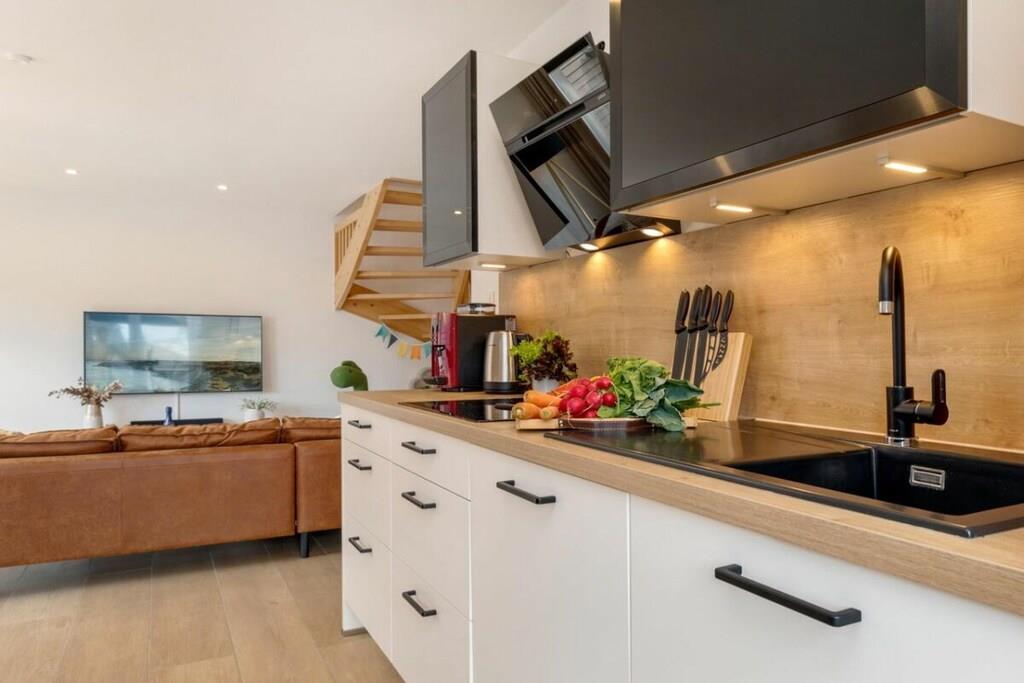 Die Ferienwohnung Suite Windrose gehört zu der exklusiven Ferienanlage Strandwiese. Die Architektur der Ferienwohnung lässt Ihr Urlauberherz höher schlagen, denn durch die bodentiefen Fenster, gelangt viel Licht und Lebensfreude in Ihre Suite Windrose. Die Größe der Suite, von ca.83m², ist ideal für Familien geeignet. Im 1. Obergeschoss befindet sich das großzügige, charmante Wohn/Esszimmer mit nahtlosem Übergang zur sehr gut ausgestatteten Einbauküche mit einem Induktionsherd und einem Kaffeevollautomaten. Hier macht kochen Spaß. Weiterhin befindet sich das Badezimmer mit Doppelwaschtisch und bodengleicher Dusche sowie ein Schlafzimmer mit einem großen Doppelbett (2,00 x 2,00 m) auf dieser Etage. Auf dem großem Südwestbalkon können Sie den Sonnenuntergang beobachten und in der Abendsonne einen Cocktail genießen. Oder entspannen Sie sich einfach nach Lust und Laune in Ihrer eigenen Sauna im Dachgeschoss und kühlen Sie sich anschließend auf dem 2. Balkon der Suite und der direkt angrenzenden Regendusche ab. Ein zweites Schlafzimmer (Doppelbett 1,80 x 2,00 m) mit sichtbaren Dachbalken und gemütlichem indirekten Licht sowie ein weiteres Badezimmer vervollständigen diese Etage und lassen Ihnen in der oberen Etage genug Platz, um sich hier zu entfalten und den Tag auch mal bei norddeutschem Schmuddelwetter zu genießen. Vom Treppenhaus aus haben Sie einen bequemen Zugang zur Tiefgarage, in der Ihr Auto sicher auf Sie wartet. Besonderheiten: - Neubau in unmittelbarer Nähe des weißen Ostseestrandes - 2 Balkone - eigene Sauna - bodentiefe Fenster - exklusive Ausstattung - Tiefgarage Die Ferienwohnung Suite Windrose lässt Ihre Urlaubswünsche in Erfüllung gehen und wird Ihnen viel Freude, Entspannung und Ostseegefühl geben. Die Ferienanlage Strandwiese ist fertig gestellt und wunderschön geworden.