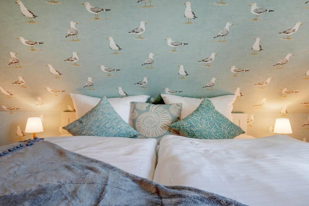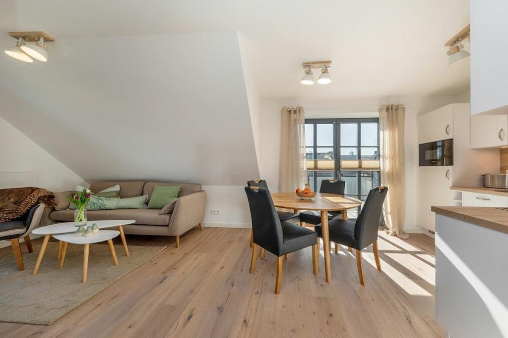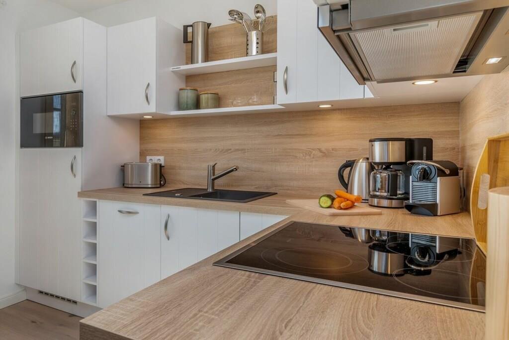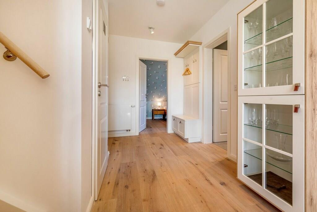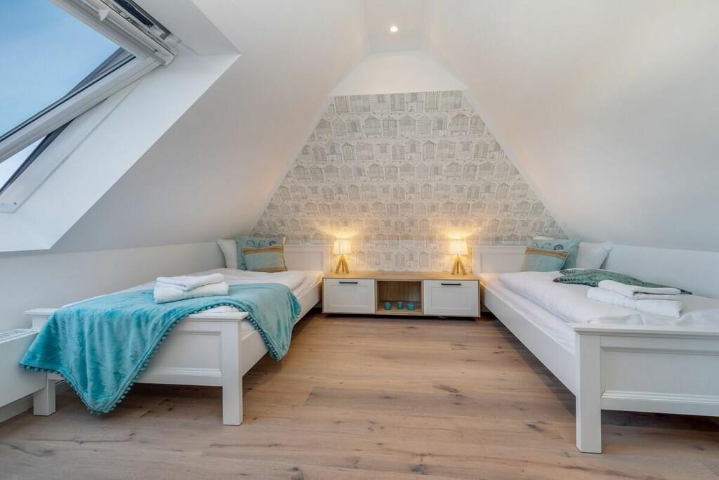 Der großzügige Wohn- und Essbereich ist mit einer modernen, voll ausgestatteten Einbauküche versehen. Diese lädt zum schmackhaftem Kochen ein. Im Wohnbereich sind ein Gas-Kamin sowie Bücher und Gesellschaftsspiele für einen geselligen Abend vorhanden. Das Schlafzimmer im unteren Bereich ist mit einem gemütlichen Boxspringbett mit den Maßen 180 cm x 200 cm und das Schlafzimmer im Dachgeschoss mit zwei Einzelbetten mit den Maßen 90 cm x 200 cm ausgestattet. Auf Anfrage können ein Kinderreisebett und ein Kinderhochstuhl dazu gebucht werden. Das Badezimmer mit Dusche verfügt über neben einer Fußbodenheizung auch über ein eingebautes Radio. Die gesamte Ferienwohnung ist mit Rollos und Insektengitter an den Fenstern ausgestattet.