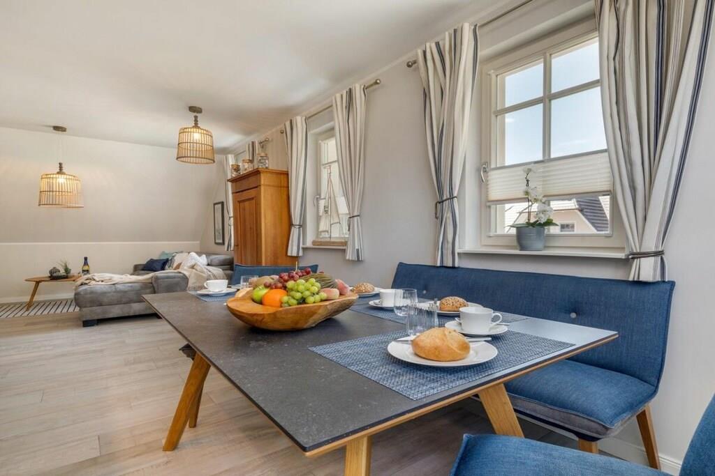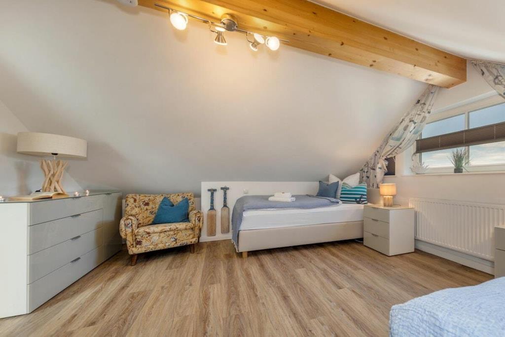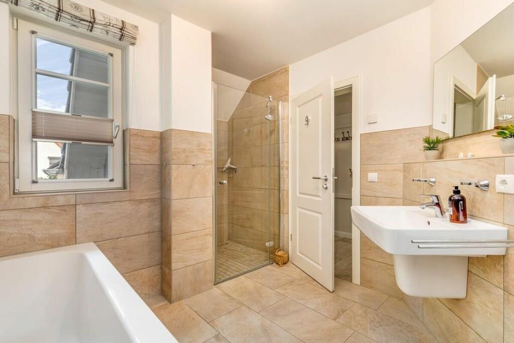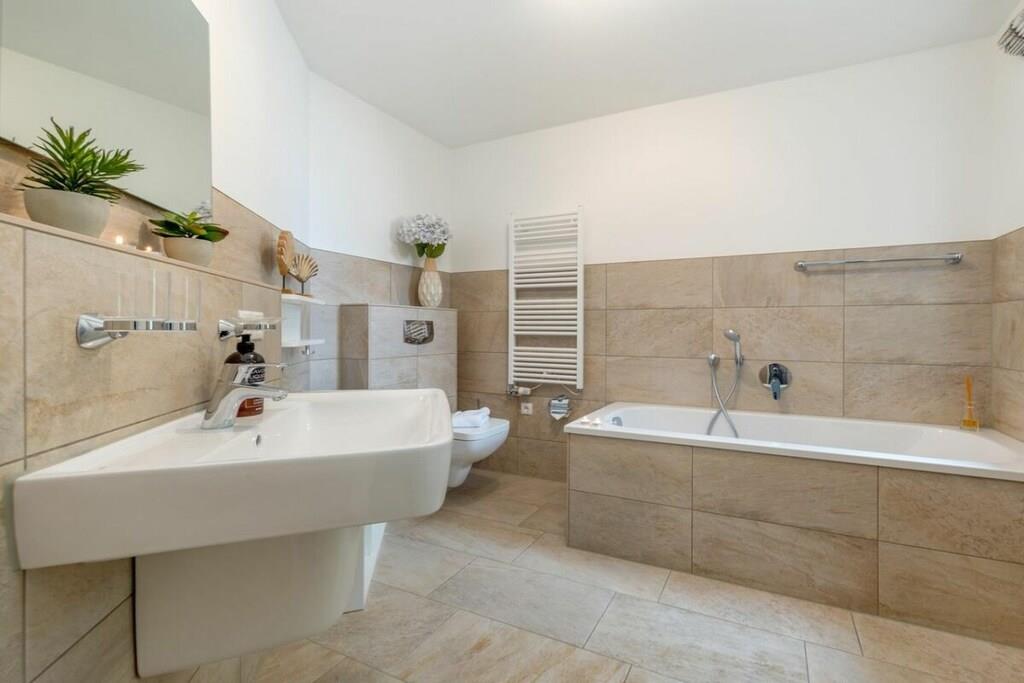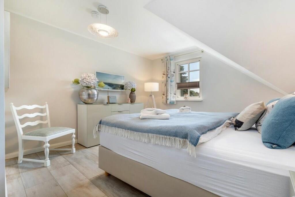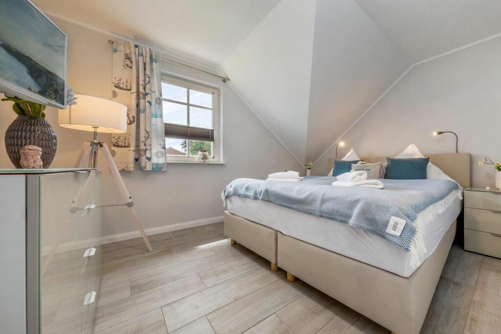 Das wunderschöne neugebaute Mehrfamilienhaus, mit 4 Wohnungen, in ruhiger Lage, lädt für entspannte Tage ein. Die Ferienwohnung befindet sich im Obergeschoss und verfügt über eine traumhafte und sehr großzügige Balkonterrasse mit Gartenmöbeln. Im großzügigen Wohn-Essbereich ist eine voll ausgestattete Einbauküche vorhanden. Ein Kamin lädt zu gemütlichen Abenden ein. Das Badezimmer verfügt neben einer ebenerdigen Dusche auch über eine Badewanne. Im großen Schlafzimmer befindet sich ein Boxspringbett mit den Maßen 180 cm x 200 cm. Das zweite Schlafzimmer ist mit zwei Einzelbetten mit 90 x 200 cm ausgestattet. Beide Schlafzimmer sowie der Wohn-Essbereich sind mit einem Fernseher versehen. Des weiteren befindet sich für Sie ein abschließbarer Fahrradabstellraum im Außenbereich (Erdgeschoss). Genießen Sie Ihren Urlaub in unserem traumhaften Zingst an der Ostsee.