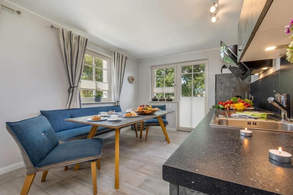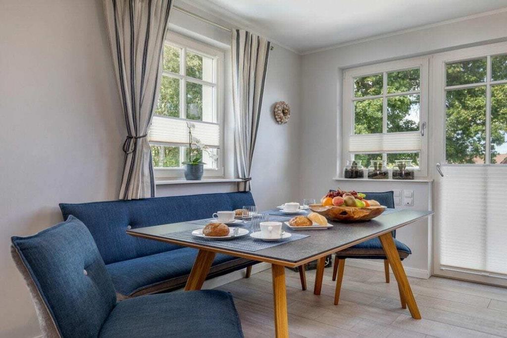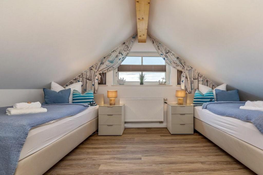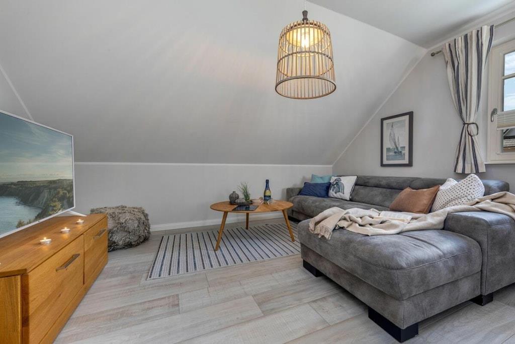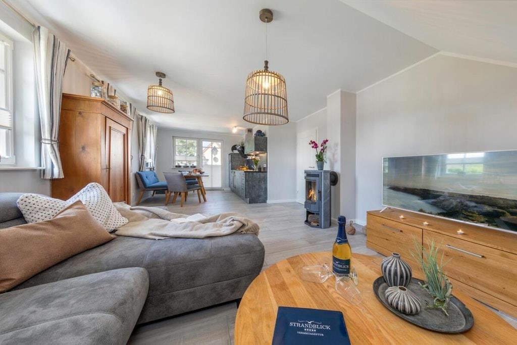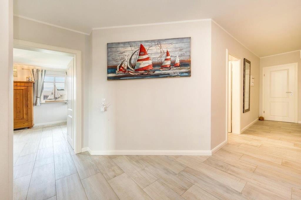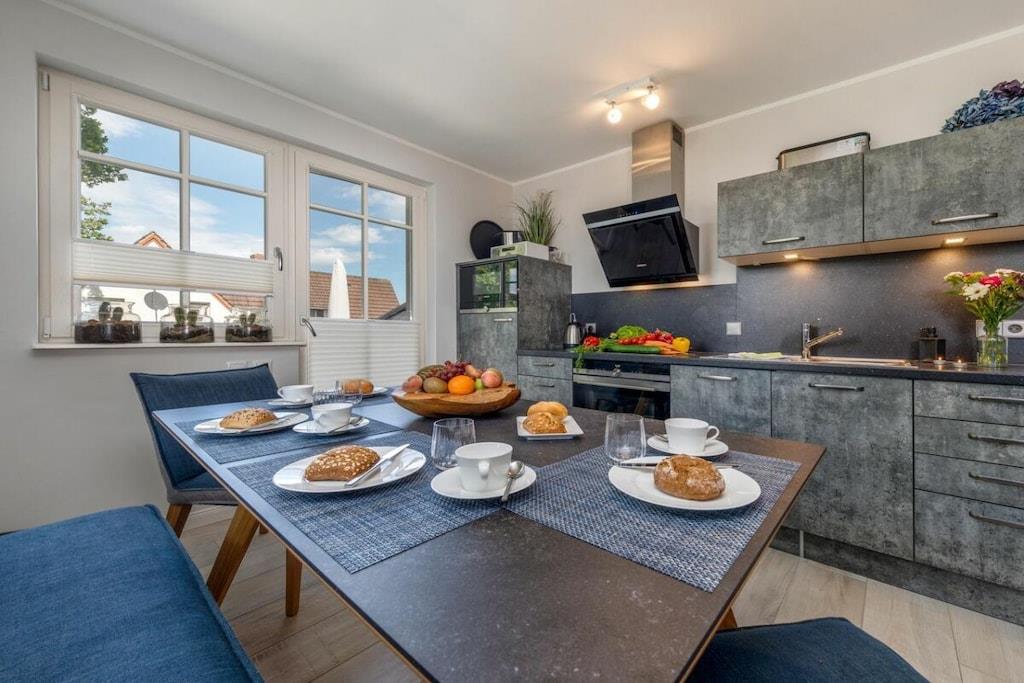 Das wunderschöne neugebaute Mehrfamilienhaus, mit 4 Wohnungen, in ruhiger Lage, lädt für entspannte Tage ein. Die Ferienwohnung befindet sich im Obergeschoss und verfügt über eine traumhafte und sehr großzügige Balkonterrasse mit Gartenmöbeln. Im großzügigen Wohn-Essbereich ist eine voll ausgestattete Einbauküche vorhanden. Ein Kamin lädt zu gemütlichen Abenden ein. Das Badezimmer verfügt neben einer ebenerdigen Dusche auch über eine Badewanne. Im großen Schlafzimmer befindet sich ein Boxspringbett mit den Maßen 180 cm x 200 cm. Das zweite Schlafzimmer ist mit zwei Einzelbetten mit 90 x 200 cm ausgestattet. Beide Schlafzimmer sowie der Wohn-Essbereich sind mit einem Fernseher versehen. Des weiteren befindet sich für Sie ein abschließbarer Fahrradabstellraum im Außenbereich (Erdgeschoss). Genießen Sie Ihren Urlaub in unserem traumhaften Zingst an der Ostsee.