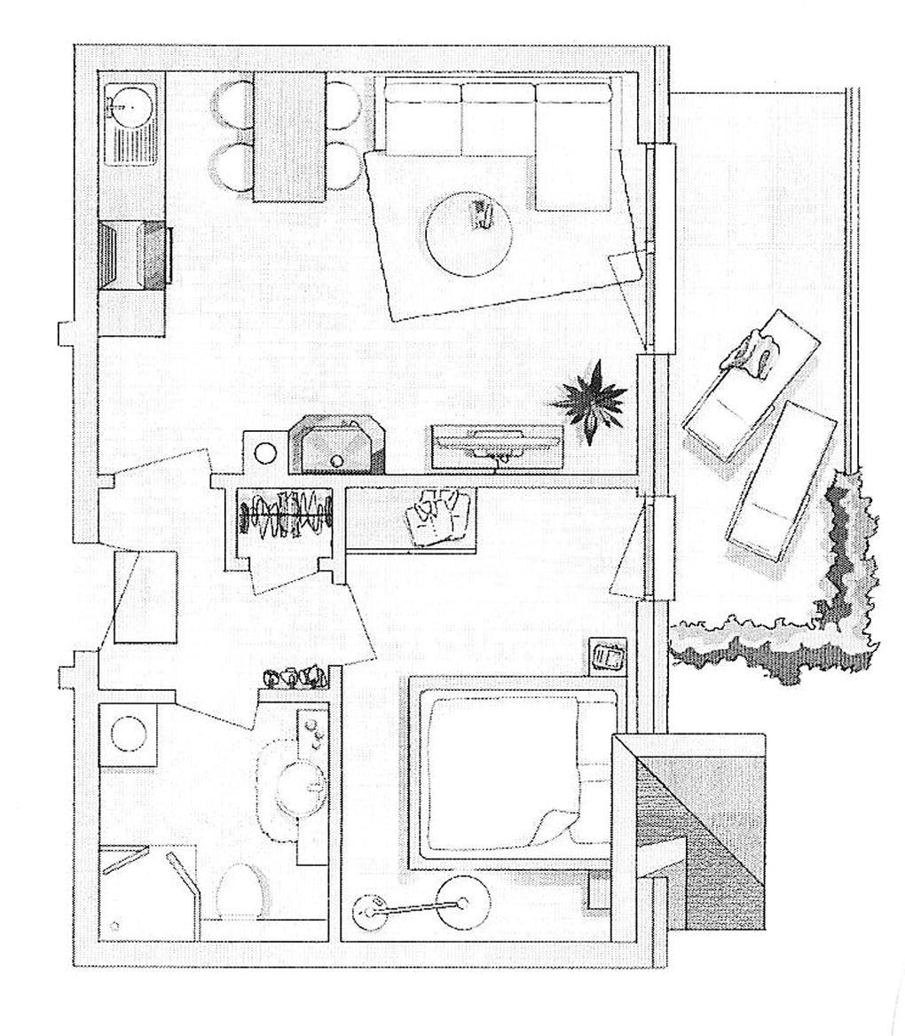 D 67.40 Wohnung 1-3 Pers.: 2-Zimmerwohnung mit 46 qm Wohnfläche, 1. Etage. Wohn-/Essraum mit Couchgarnitur (Ausziehcouch 1 Pers.), Sat-TV, Esstisch, Küchenzeile (Backofen, Spülmaschine). Doppelzimmer. Bad/WC. Balkon mit Sitzmöbeln.