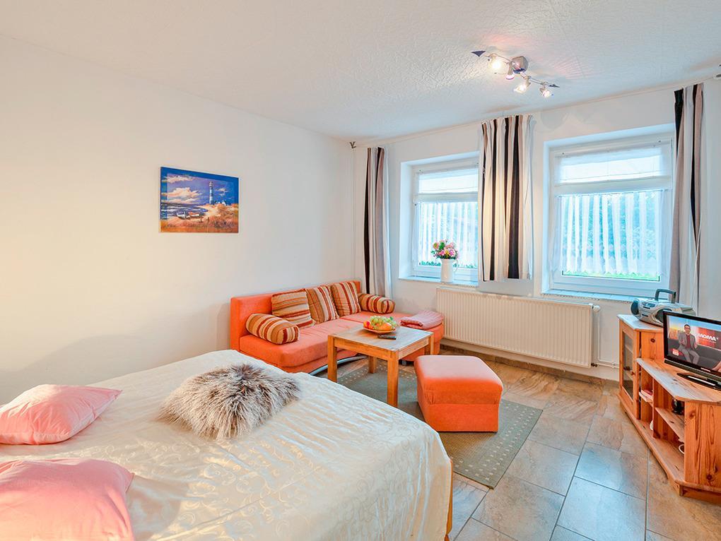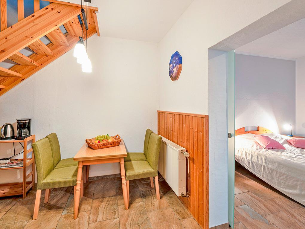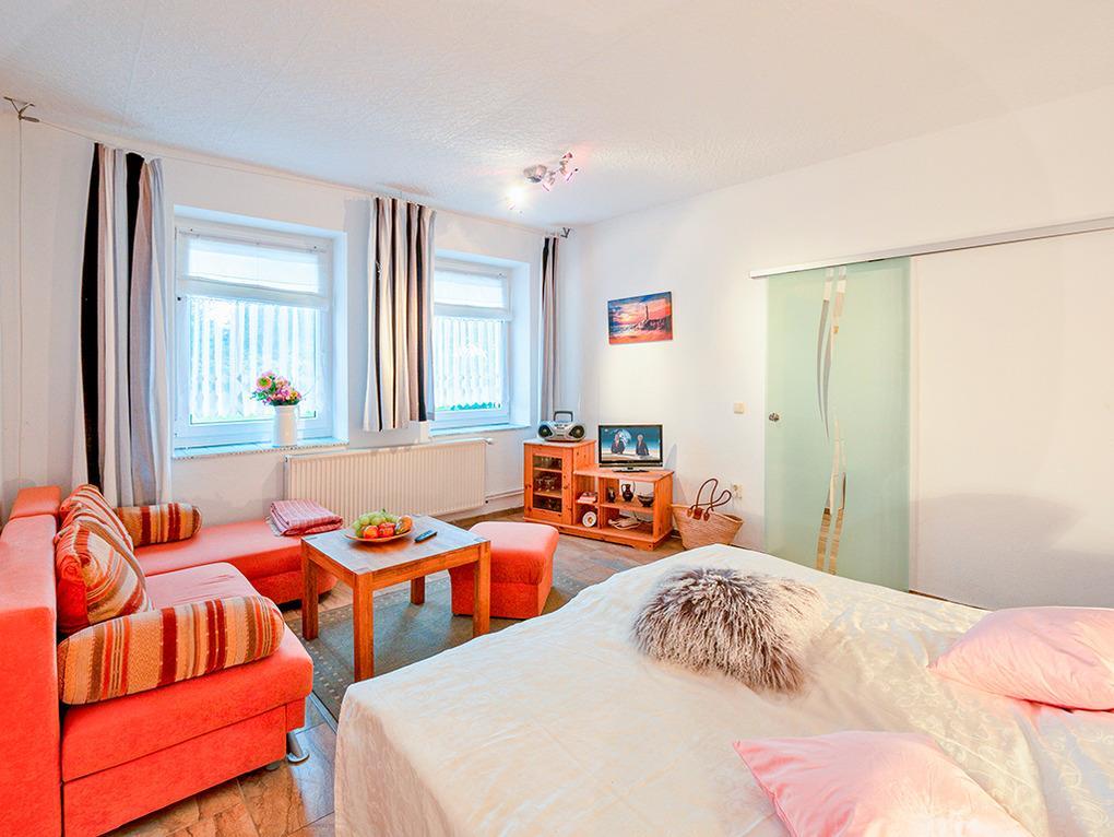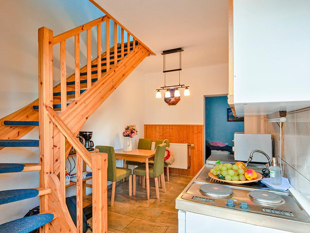 D 67.76 Wohnung 1-4 Pers.: 2 ½ -Zimmerwohnung mit 55 qm Wohnfläche über 2 Etagen. Parterre: Freundlicher Wohn-/Essraum mit Esstisch, Pantryküche (2-Plattenherd, Mikrowelle). Doppelzimmer mit Doppelbett, Sitzgarnitur, Sat-TV, Radio/CD. Bad/WC. Treppe in die 1. Etage (offen zum Flur): Doppelzimmer.