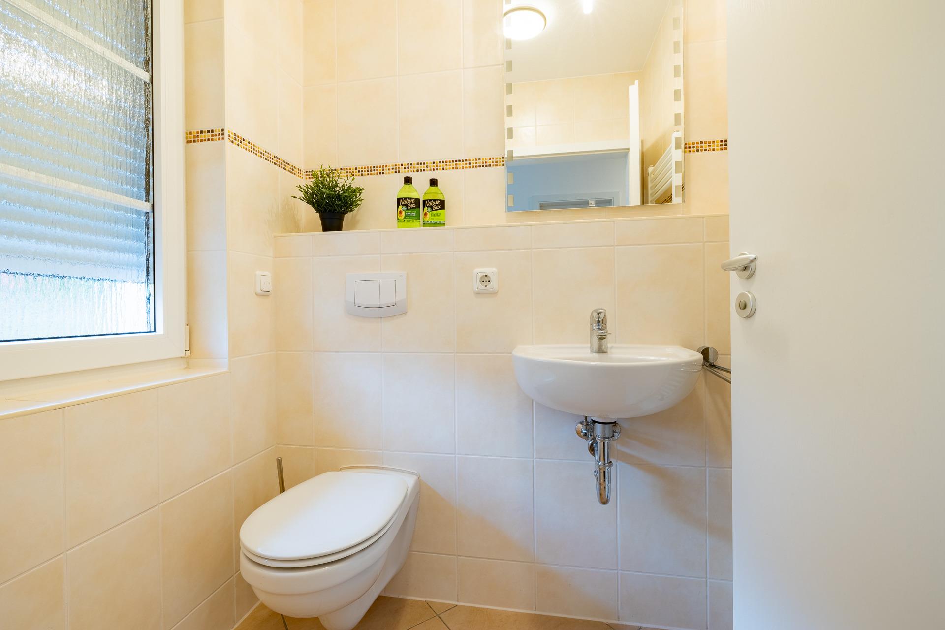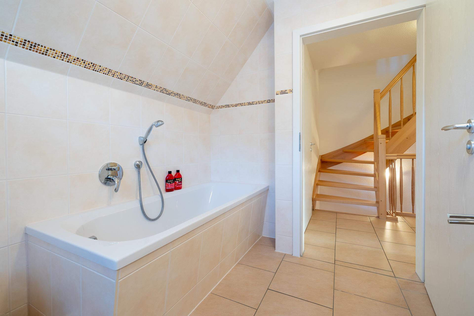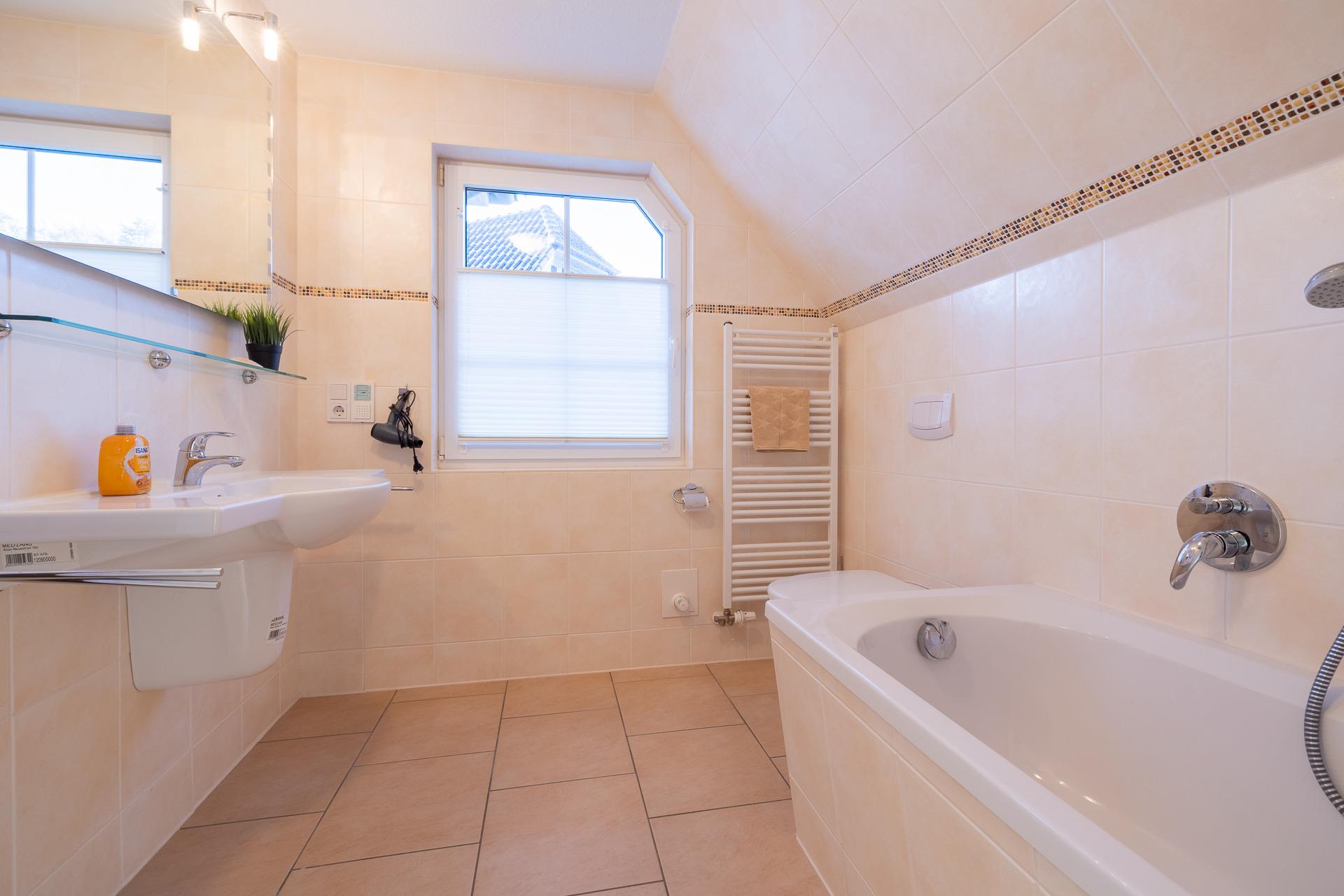 Ebenfalls im 1 Obergeschoss das große Badezimmer mit Badewanne, Dusche und WC sowie die hauseigene Sauna.