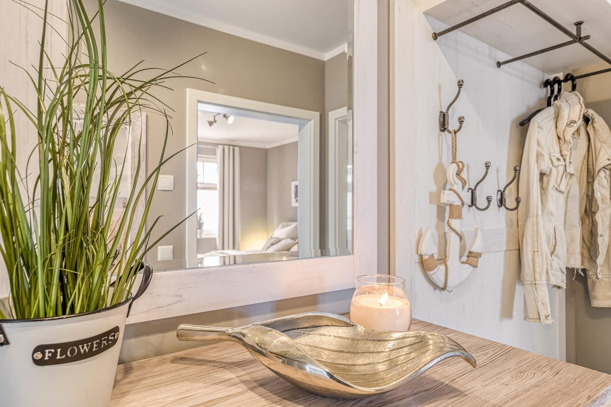 Die exklusiv eingerichtete Wohnung verfügt über einen Wohnraum mit angrenzendem Ess- und Küchenbereich, einem Bad, einem Schlafzimmer, einer Diele und einer Terrasse mit Sitzgruppe und Sonnenschirm. Die voll ausgestattete Küche mit Induktionsherd, eingebautem Hochbackofen, eingebauter Mikrowelle, Spülmaschine, Kühlschrank mit Gefrierfach, sowie Kaffee- und Senseomaschine bildet mit der Essecke und dem Wohnbereich eine gemütliche Einheit. Das moderne Bad besticht durch den ebenerdigen Duschbereich mit Kopfbrause, einem Handtuchheizkörper und einem eingebauten Radio. Das Schlafzimmer ist mit einem Boxspringbett und einem LED Fernseher ausgestattet.