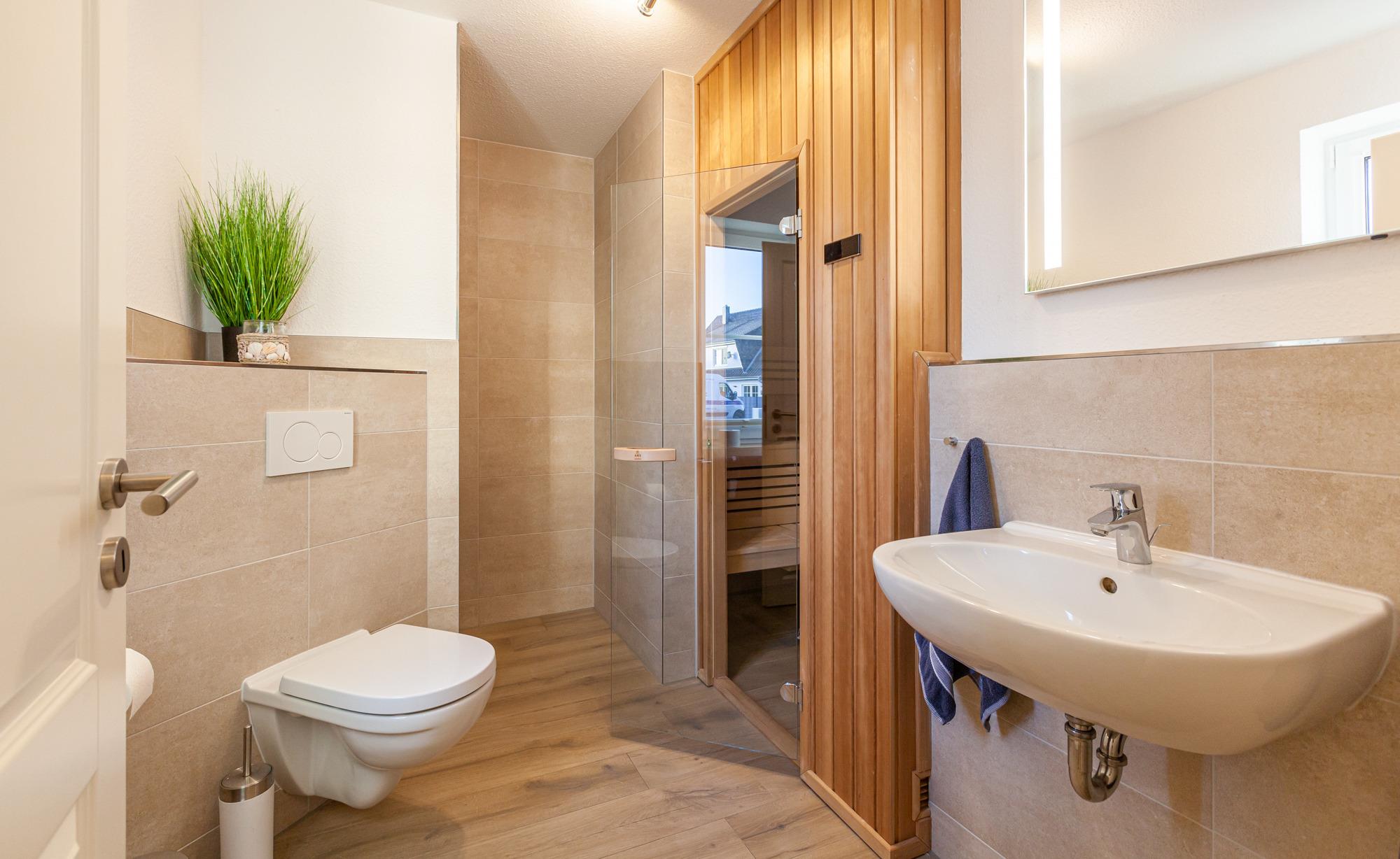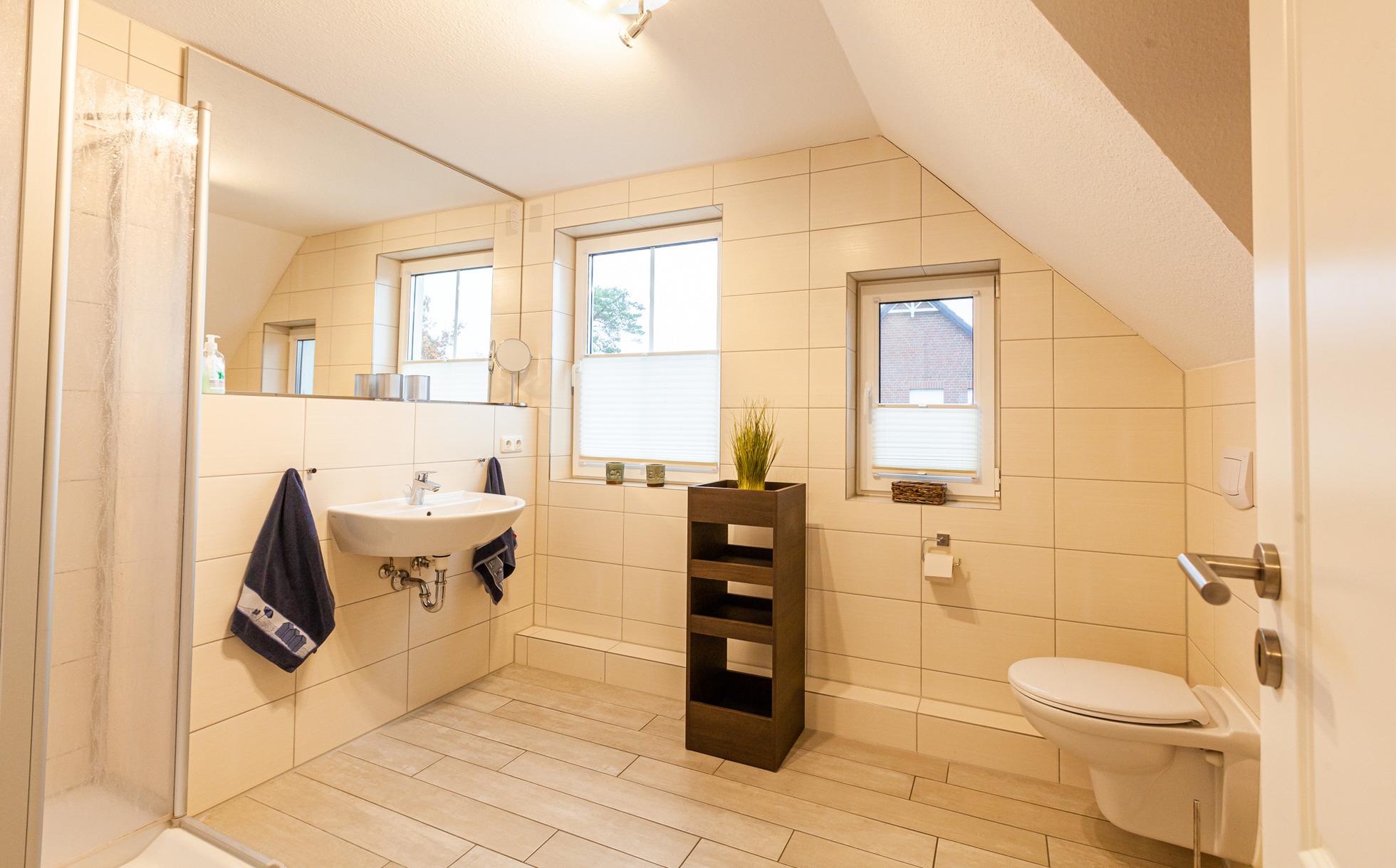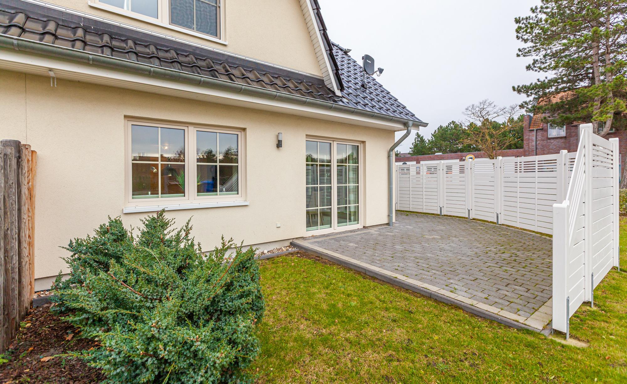 1 x bodengleiche Dusche / WC). Zur weiteren Einrichtung gehören zwei LCD-TV´s mit SAT-TV und WLan im ganzen Haus, Fußbodenheizung und Fliegenschutzgitter, Waschmaschine, Wäschetrockner, ein Kinderreisebett und Kinderhochstuhl. Eine Terrasse mit Gartenmöbeln, ein Grill sowie ein eigener Garten. Zwei Pkw-Stellplätze, ein Fahrradabstellraum, stehen Ihnen zur Verfügung. Die Entfernung zum Strand beträgt ca. 900 Meter und zum Zentrum sind es ca. 10 Minuten Fußweg. Ein Kinderspielplatz befindet sich in unmittelbarer Nähe.