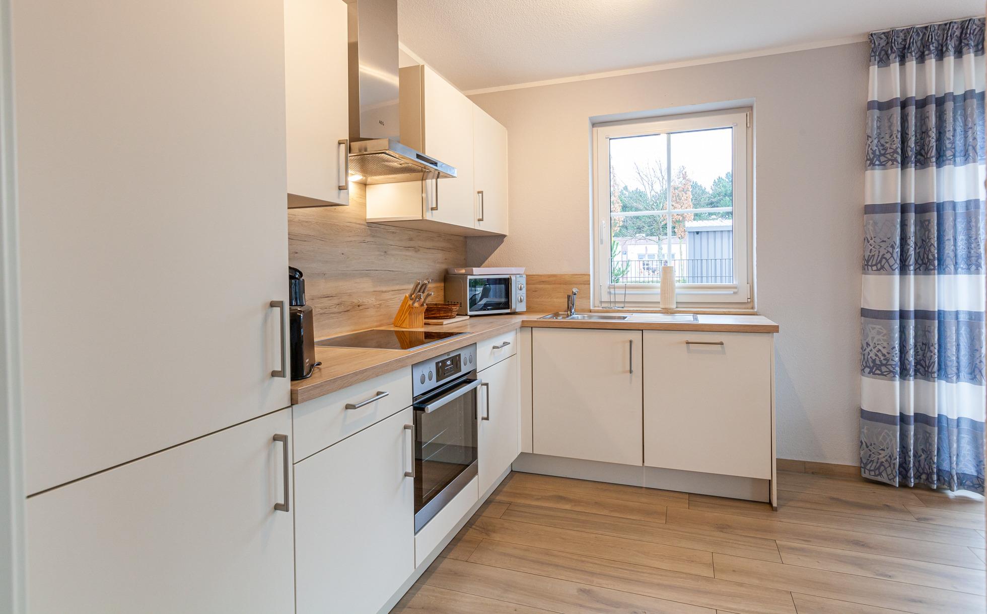 ... und ist ausgestattet mit drei Schlafräumen (1x1 Doppelbett, 1x1 Doppelbett, 1x2 Einzelbetten) jeweils mit zusätzlichen Verdunklungsmöglichkeiten, einem Wohnbereich mit Kamin und einer Küchenzeile (Mikrowelle, Cerankochfeld, Backofen, Kühlschrank mit Gefrierfach, Spülmaschine, Kaffeemaschine), zwei Bädern (1 x bodengleiche Dusche / WC und Sauna,