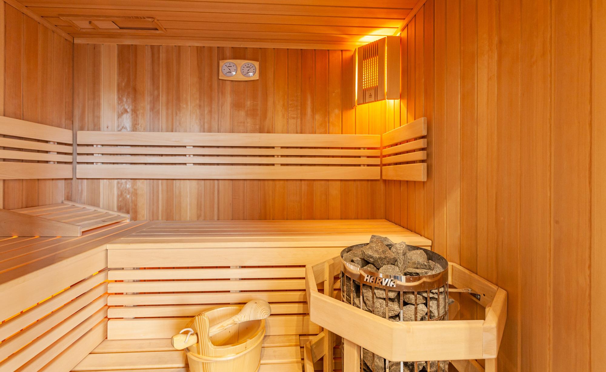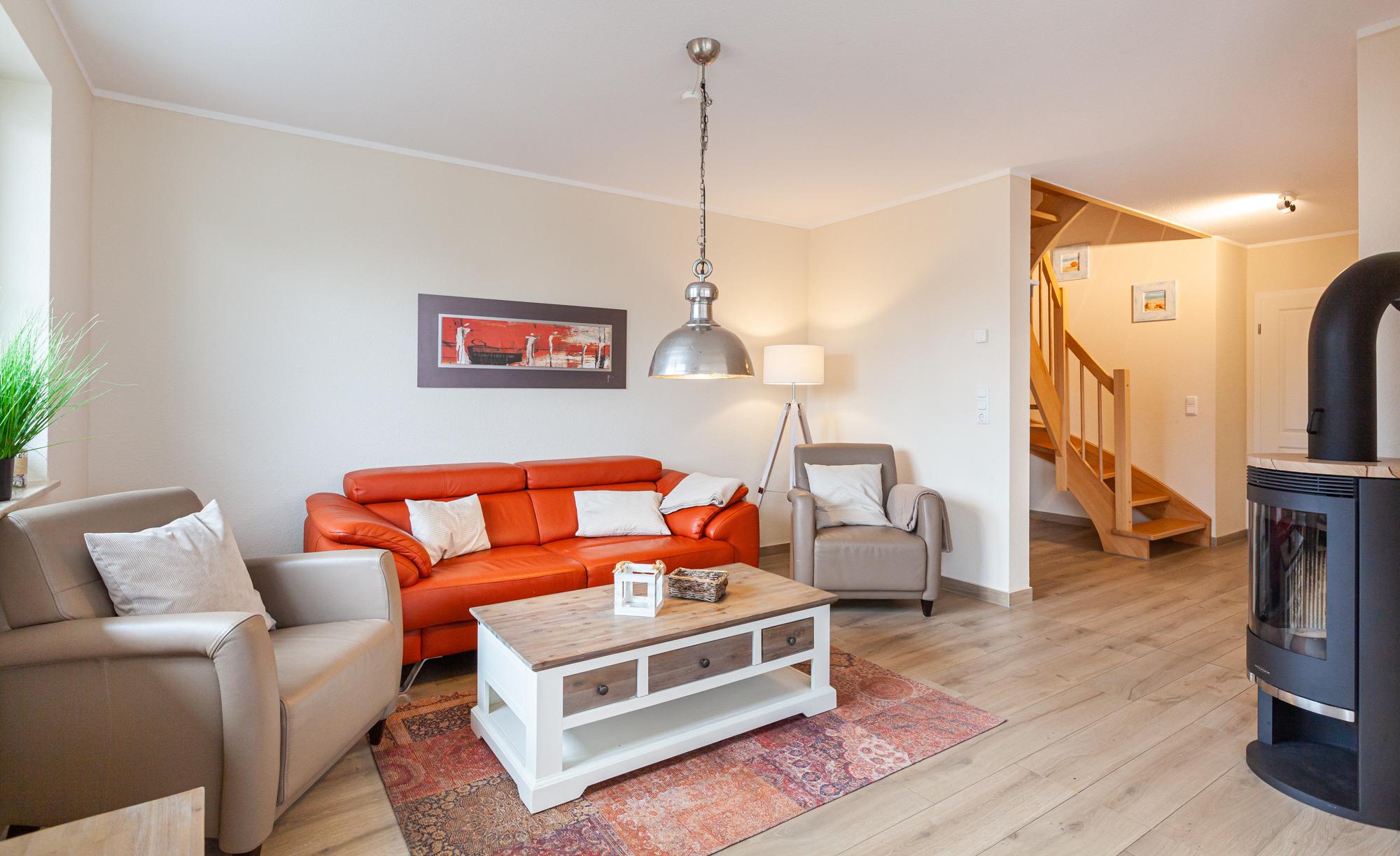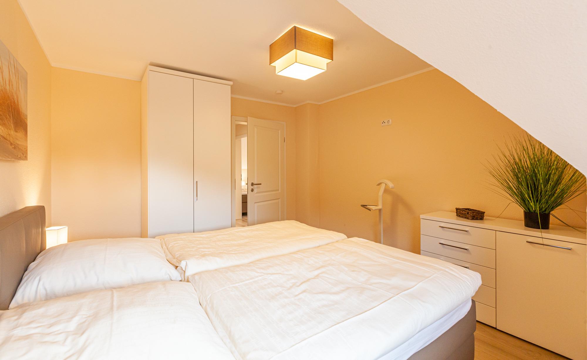 ... und ist ausgestattet mit drei Schlafräumen (1x1 Doppelbett, 1x1 Doppelbett, 1x2 Einzelbetten) jeweils mit zusätzlichen Verdunklungsmöglichkeiten, einem Wohnbereich mit Kamin und einer Küchenzeile (Mikrowelle, Cerankochfeld, Backofen, Kühlschrank mit Gefrierfach, Spülmaschine, Kaffeemaschine), zwei Bädern (1 x bodengleiche Dusche / WC und Sauna,