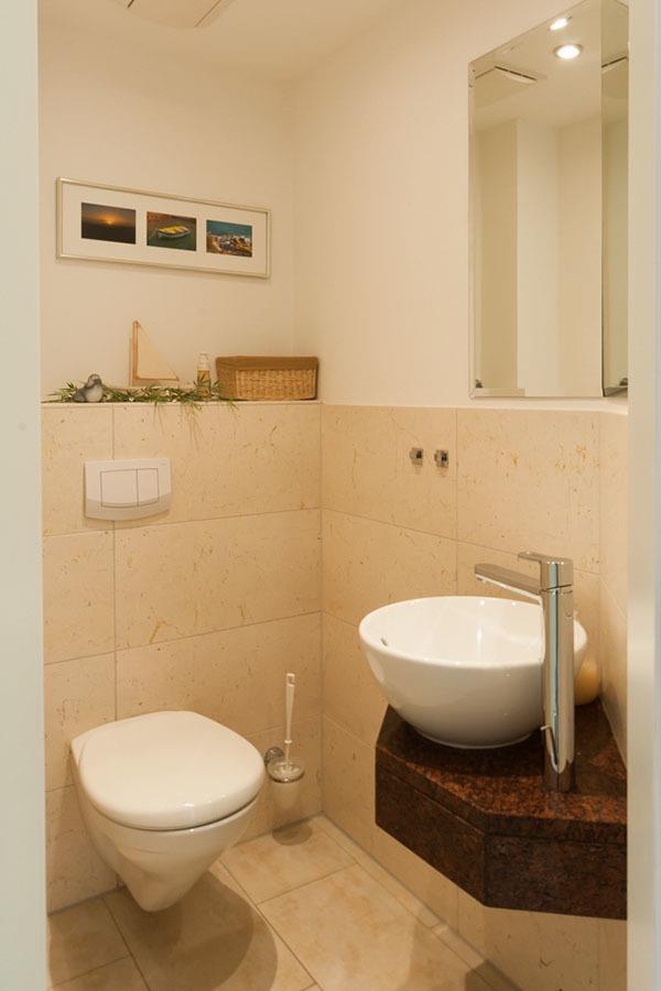 Wohnung gehören 2 Schlafzimmer (Boxspringbetten jeweils 90 x 200) mit Flachbild-Fernseher und Parkettboden, ein Bad mit ebenerdiger Dusche, Handtuchheizung und WC, sowie ein separates WC (beides Marmor).