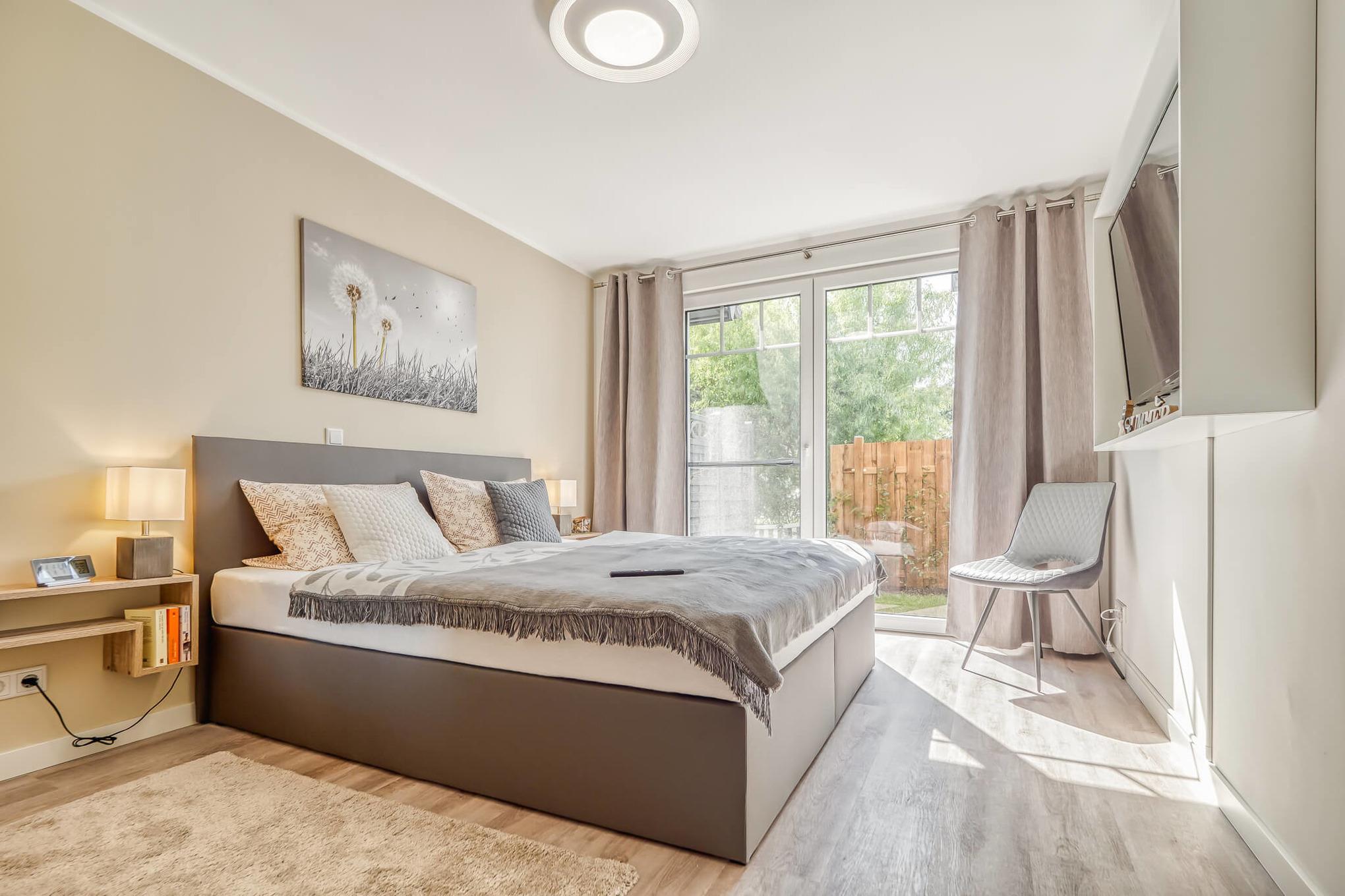 Das Schlafzimmer besitzt ein Boxspringbett (180x200) mit durchgehendem Topper,