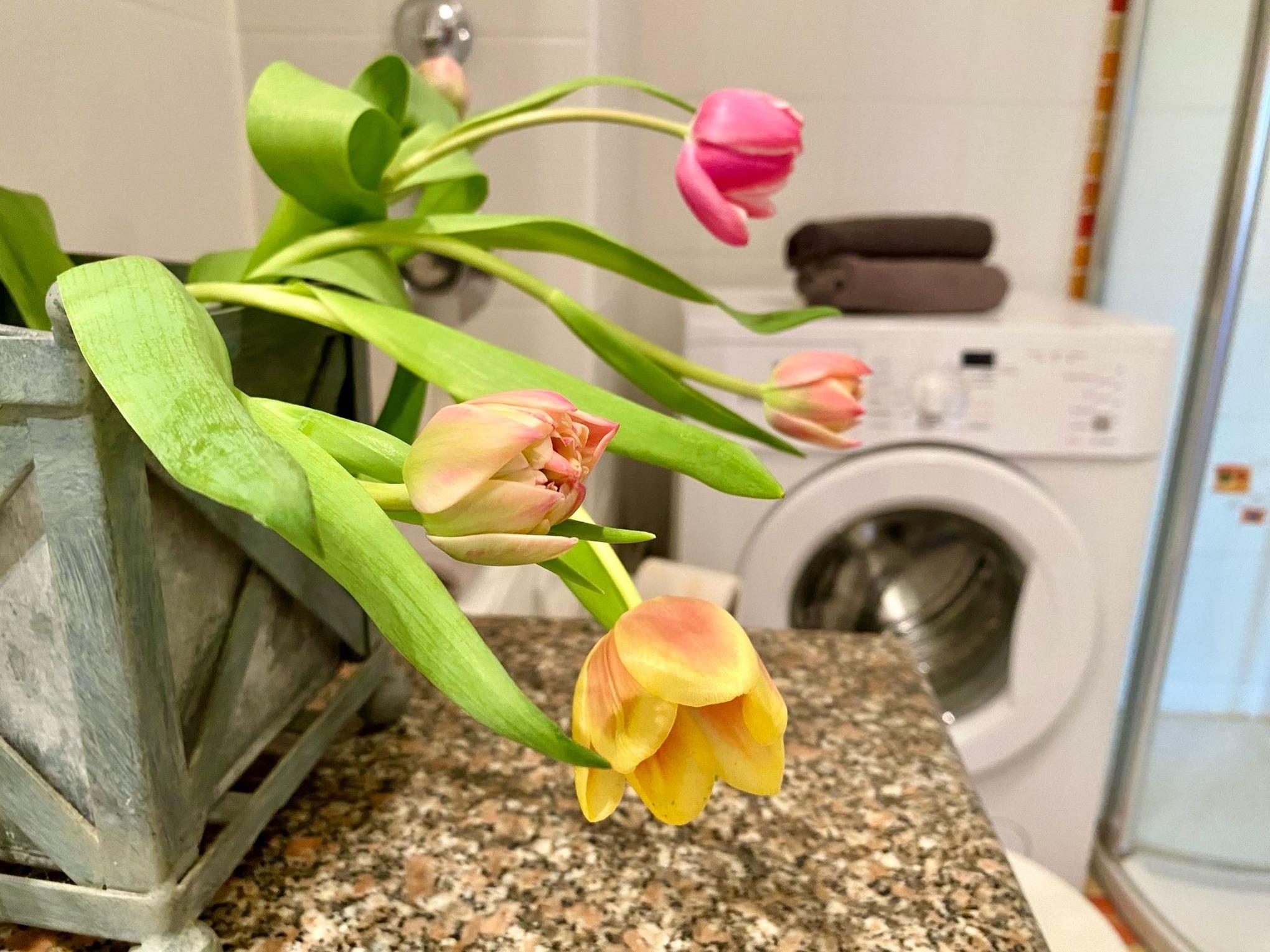Badezimmer mit Dusche und WC, Waschmaschine, Schlafzimmer mit Doppelbett und einem EInzelbett.