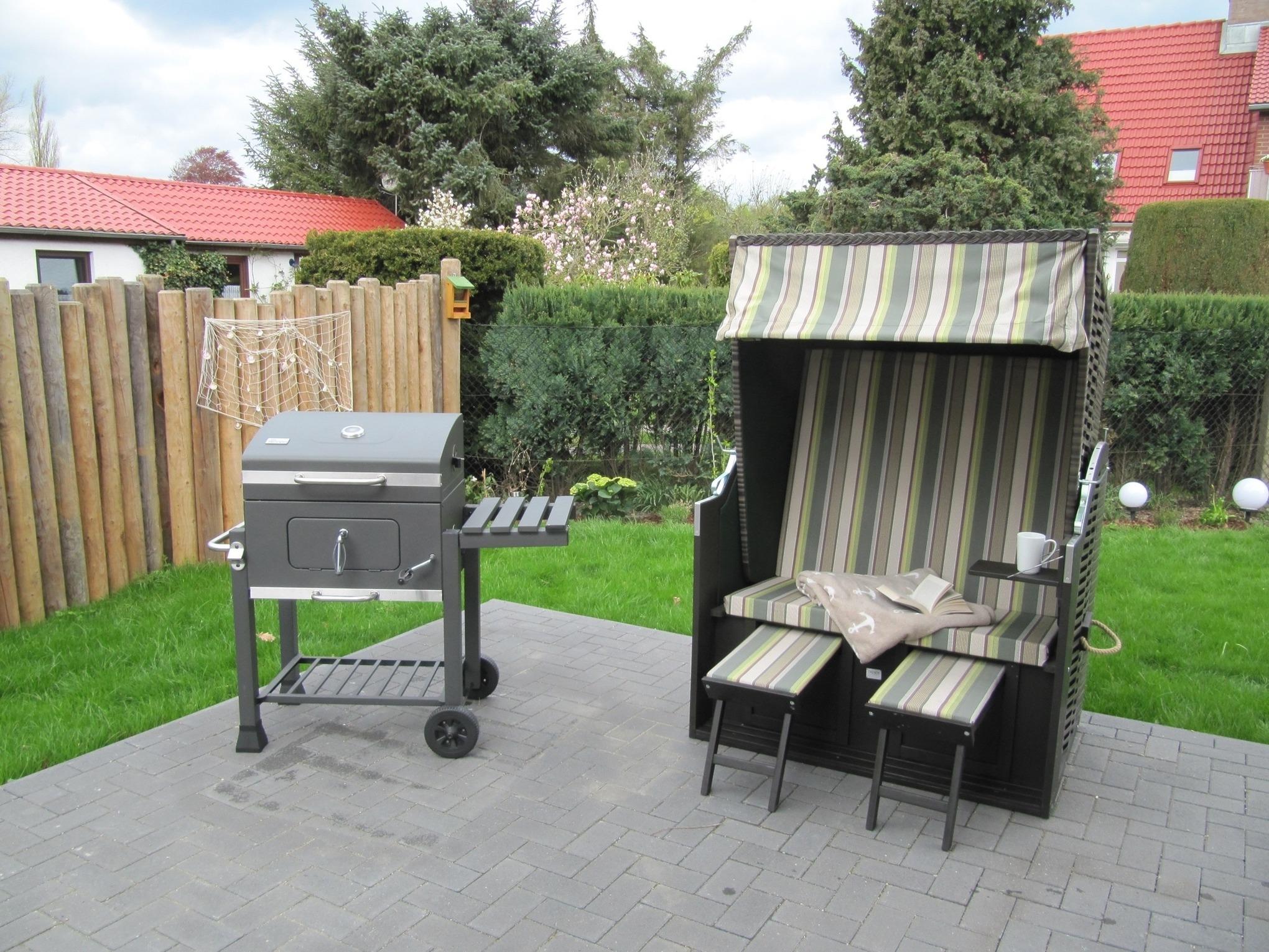 Die zwei Bäder sind jeweils mit Dusche, Waschtisch und WC ausgestattet. An kühlen Tagen lädt Sie die Sauna zum Entspannen ein. Im Hauswirtschaftsraum befindet sich eine Waschmaschine inklusive Trockner. Auf dem ca. 400 m² großen Grundstück stehen Ihnen eine großzügige Süd/West-Terrasse mit bequemen Gartenmöbeln, Strandkorb und Grill, sowie ein eigener Garten zur Verfügung. Zwei PKW -Stellplätze befinden sich direkt neben dem Hauseingang. In der Gartenhütte sind ausreichend Steckdosen um Ihr E-Bike zu laden.