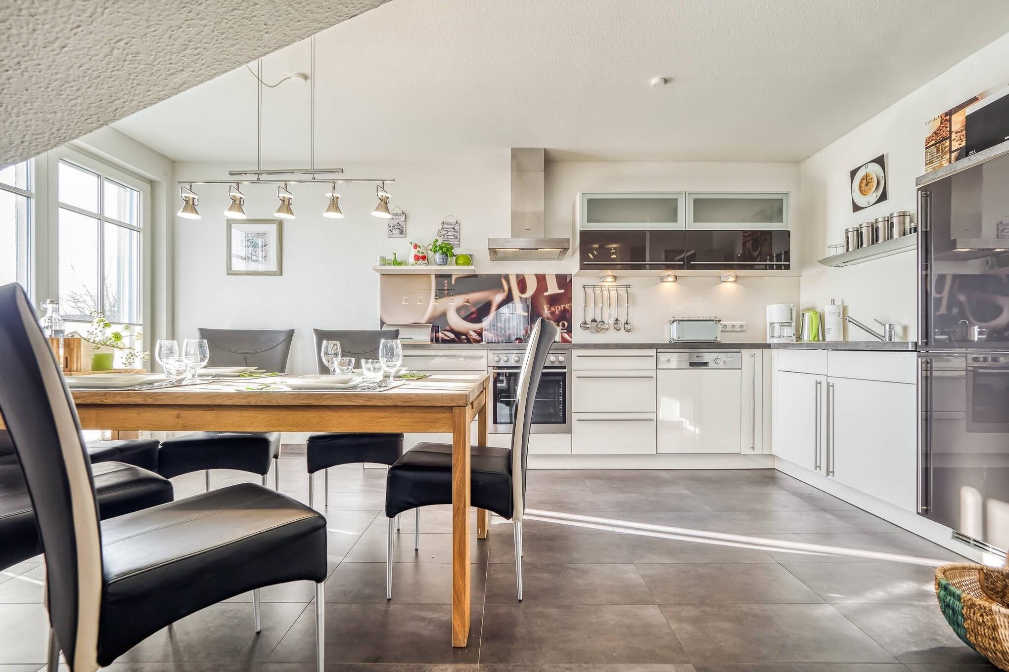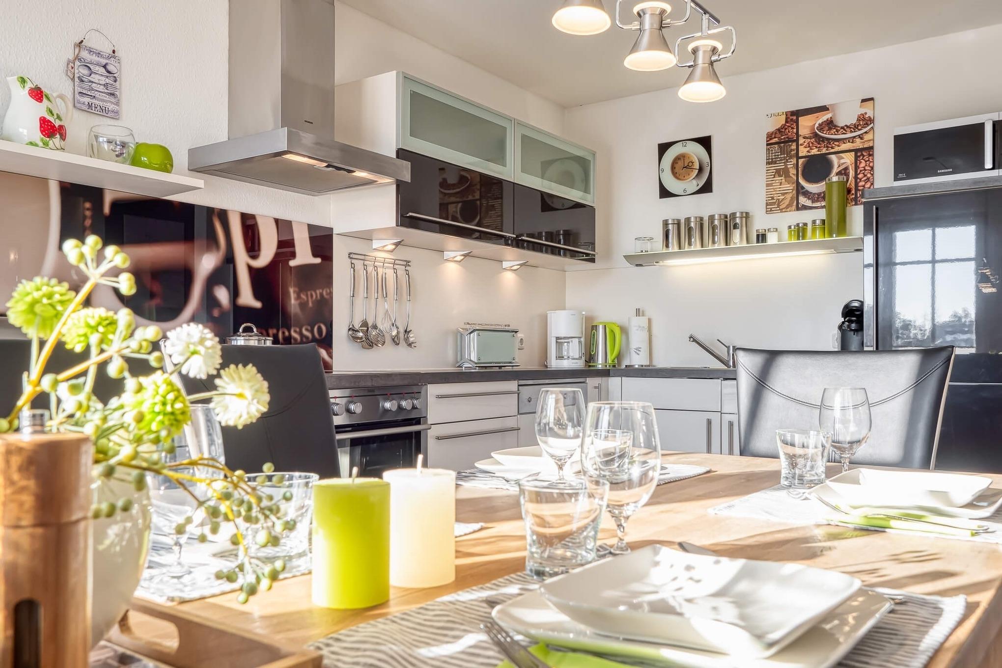 Das geflieste Wohnzimmer bietet eine Sitzecke mit elektrisch ausfahrbarem Sofa, TV u. Kamin für gemütliche, erholsame Stunden. Die moderne Küche ist mit elektrischen Markengeräten ausgestattet (inkl. Waschmaschine und Tassimo Kaffeeautomat). Sie enthält alles, was für die Selbstverpflegung benötigt wird. Der Essbereich besteht aus 6 Stühlen mit großem Esstisch.