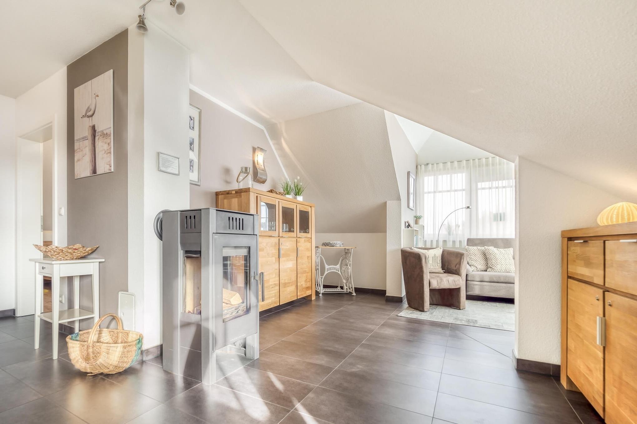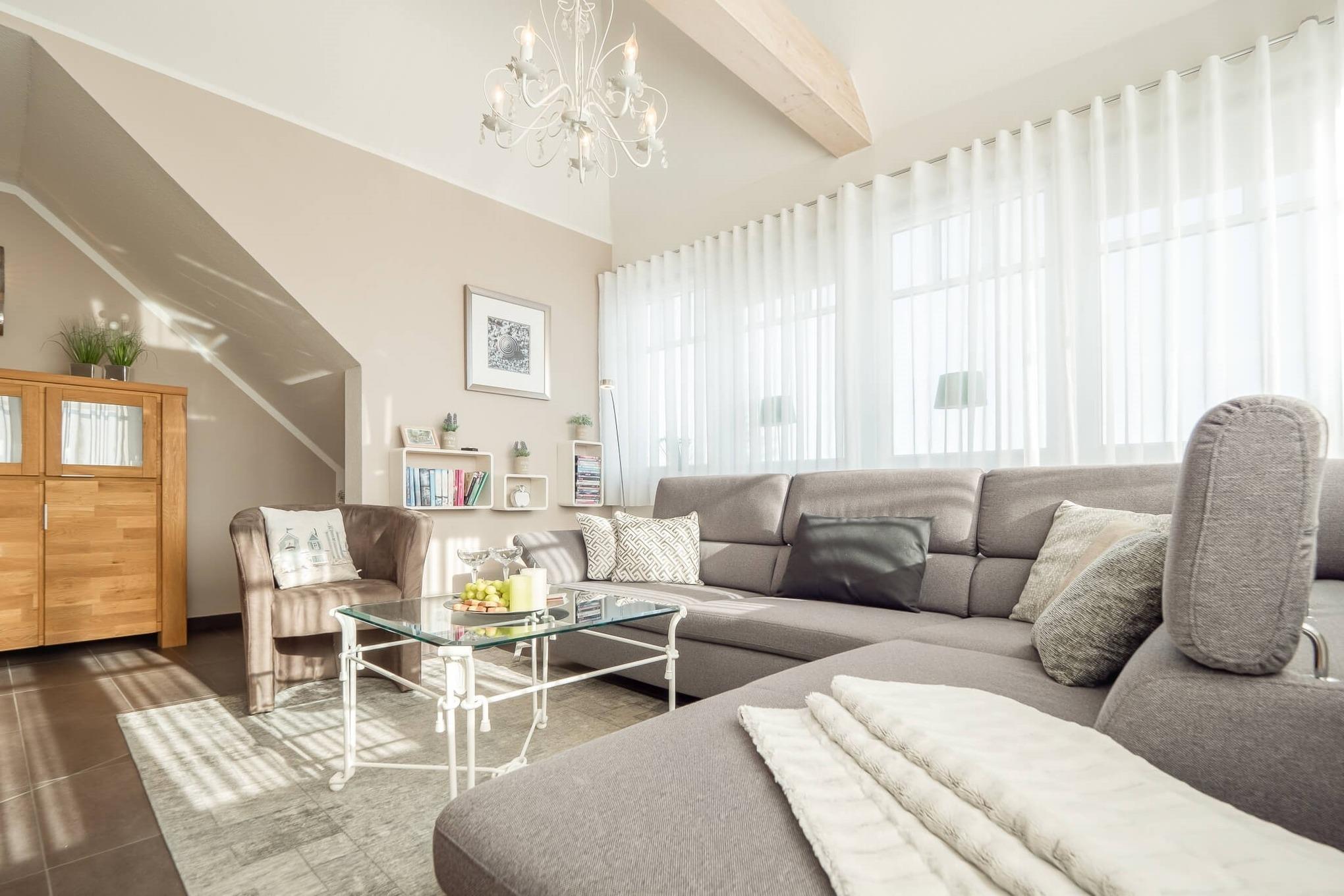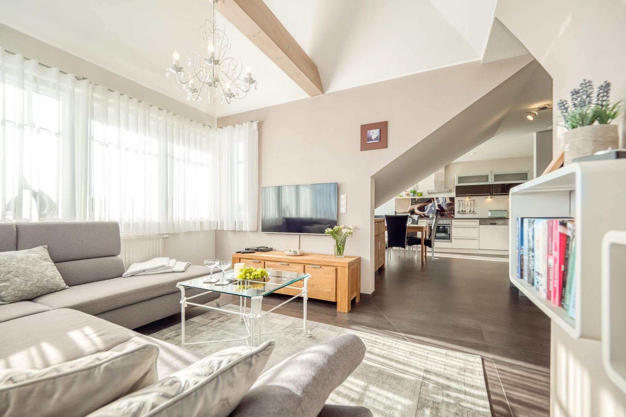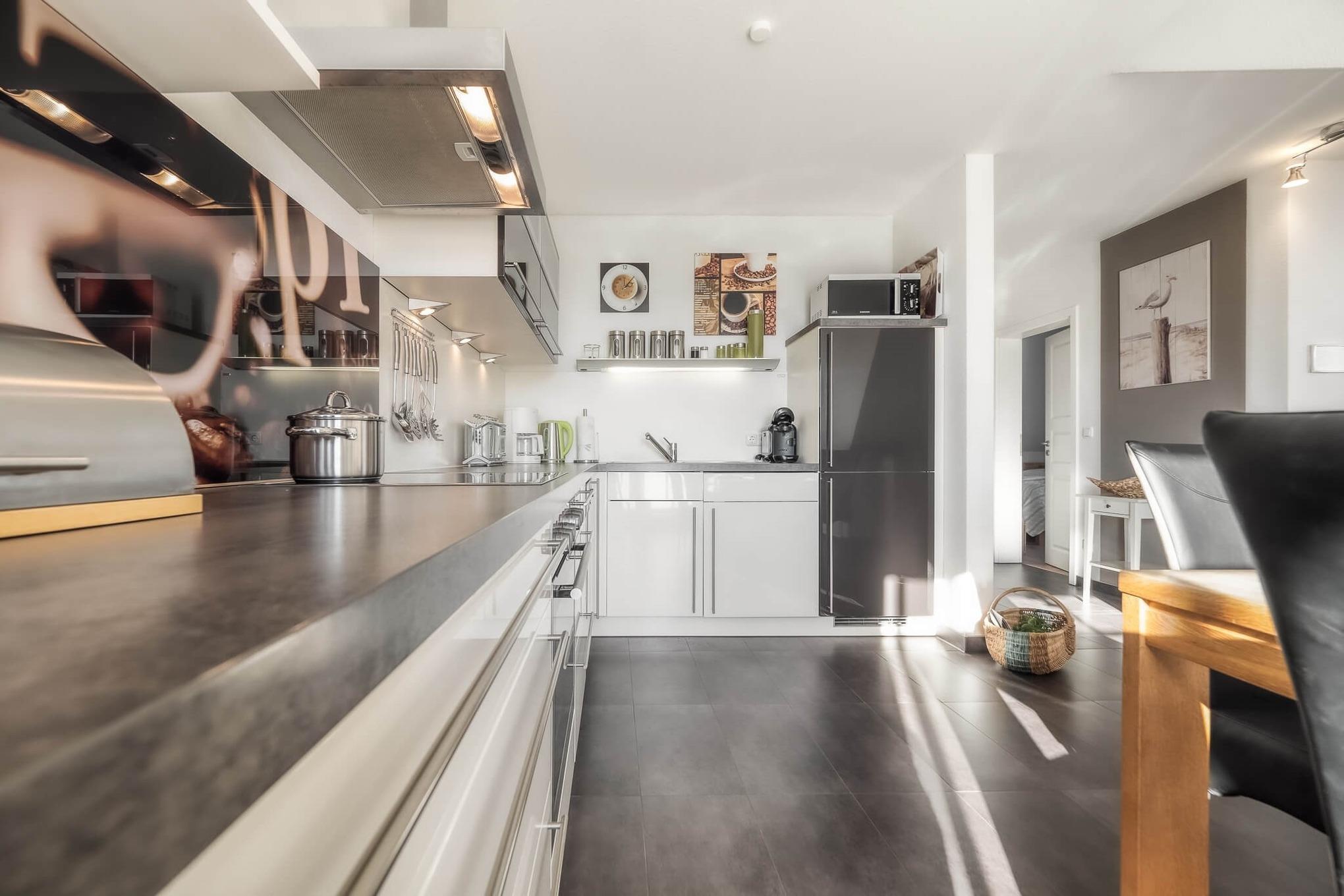 Die moderne und stilvolle 72 qm große Ferienwohnung im 2. OG besteht aus 3 Zimmern (1 Wohnzimmer mit Küche und Essbereich, 2 Schlafzimmer, Bad und Flur). Die besonders hochwertige Ausstattung wurde mit viel Liebe zum Detail ausgewählt.
