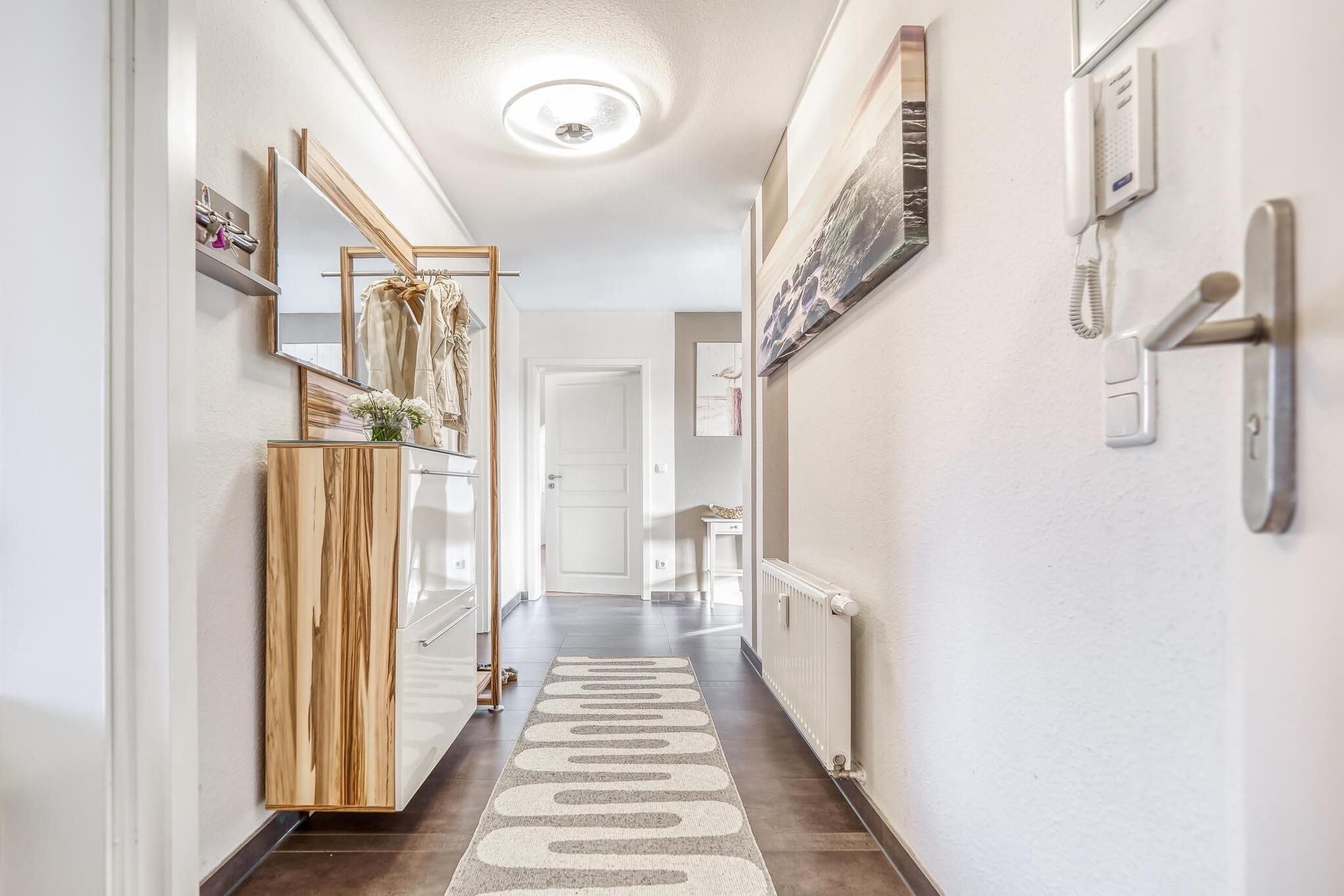 Die beiden gemütlichen Schlafzimmer sind mit Laminatfußboden ausgestattet und verfügen über einen Kleiderschrank. Im Erker des 1. Schlafzimmers befindet sich ein Schaukelstuhl zum Entspannen. Das helle, moderne Bad mit Fenstern bietet 2 Waschbecken, Dusche u. WC. Der Flur ist mit Garderobe, Schuhschrank, Telefon mit Türöffner ausgestattet. Der vom Wohnzimmer begehbare Balkon (Südlage) hat Holzfußboden und verfügt über Balkonstühle, Balkontisch und Sonnenschirm. Alle Fenster sind mit Fliegengittern versehen.