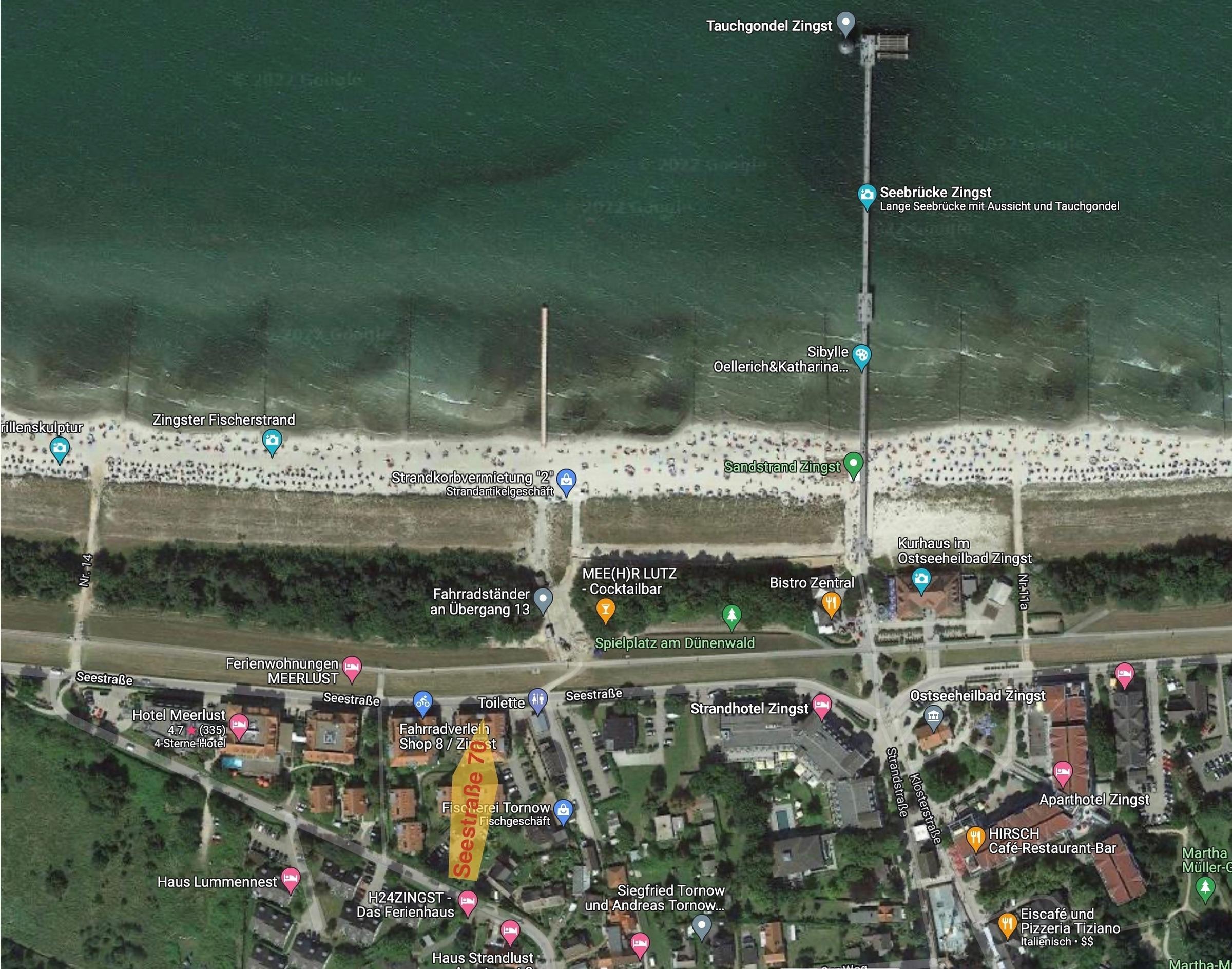 Die Entfernung zum Strand beträgt ca. 40 m, zur Seebrücke (Event-Point) 200 m. Das Zentrum beginnt bei der Seebrücke.