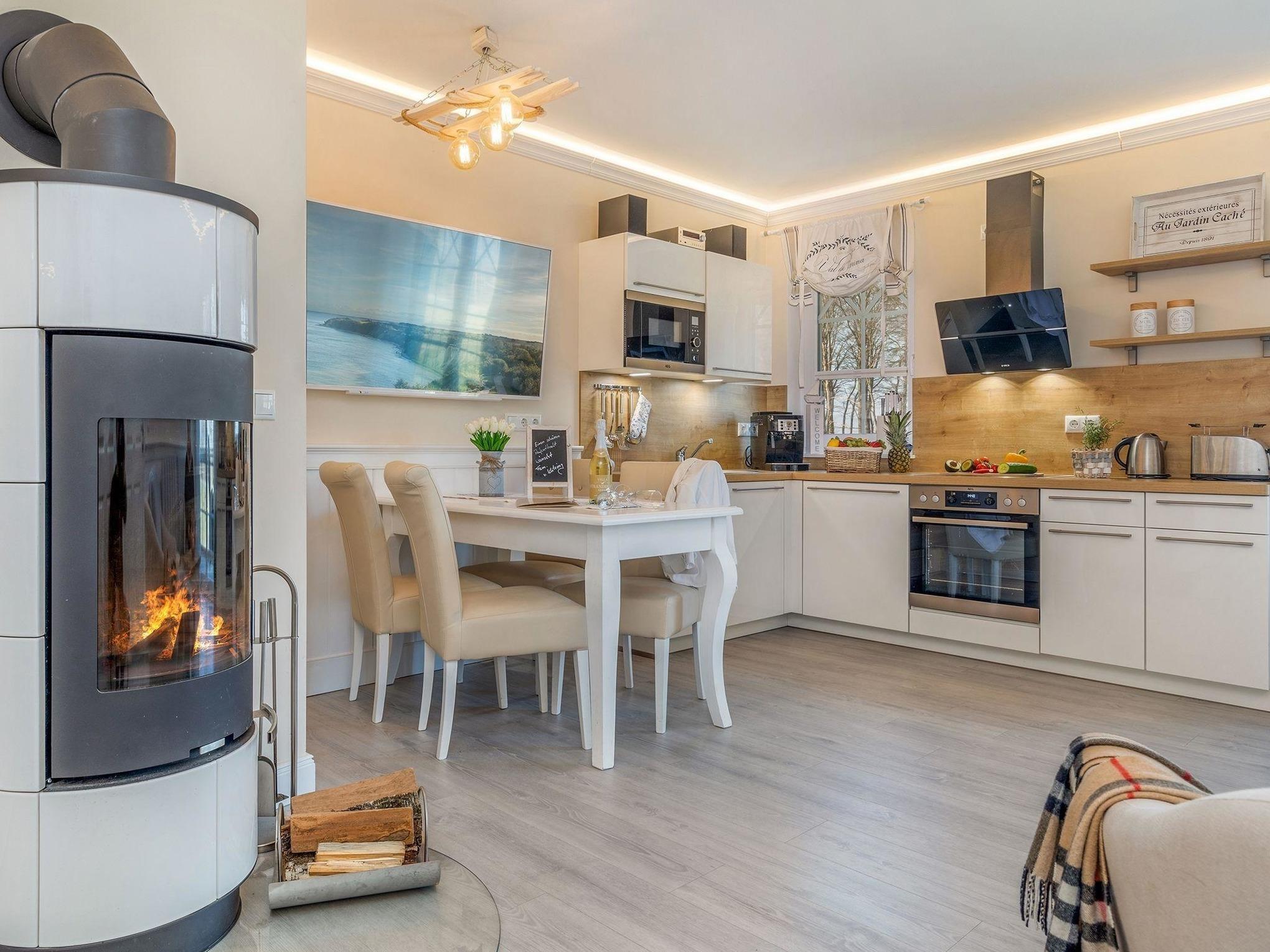 Die offene Küche ist ideal für Selbstversorger und bietet alle notwendigen Geräte, darunter Geschirrspüler, Backofen, Kühlschrank und Kaffeemaschine. Ein Esstisch lädt zum gemeinsamen Verweilen ein. Für besonderen Komfort sorgen WLAN, Fußbodenheizung und ein Kamin. Die barrierefreie Wohnung ist zudem allergikergeeignet und eignet sich für Familien mit Kleinkindern, da Kinderspielzeug und Babyfon bereitstehen. Ein Parkplatz, Fahrstuhl sowie Sicherheitsmerkmale wie Rauchmelder und Erste-Hilfe-Set runden das Angebot ab.