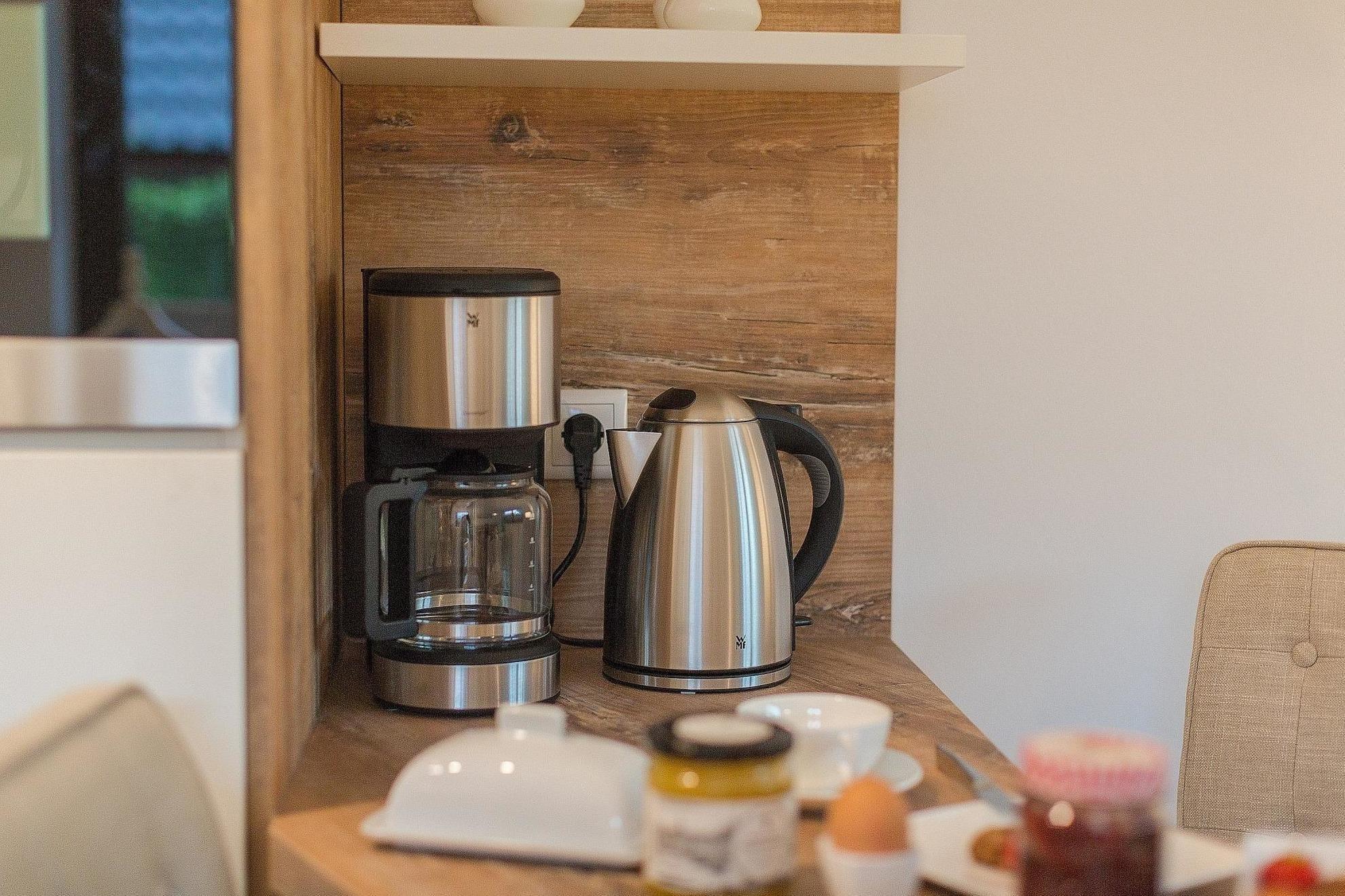 Die Ferienwohnung bietet eine komfortable und allergikergeeignete Unterkunft für maximalen Komfort. Im Wohnschlafzimmer befindet sich eine Schlafcouch, die zusätzlichen Platz für Übernachtungsgäste schafft. Die moderne Küche ist mit einem Elektro-/Gasherd, einem Backofen, einer Mikrowelle, einer Kaffeemaschine, einem Wasserkocher und einem Toaster ausgestattet, ideal für die Zubereitung von schmackhaften Mahlzeiten. Ein Kühlschrank mit Gefriermöglichkeit sorgt für frische Vorräte. Das Badezimmer verfügt über eine Dusche, einen Haartrockner sowie einen Kosmetikspiegel für den perfekten Start in den Tag. Unterhaltung bieten ein TV und eine HiFi-Anlage, während Spiele für gesellige Abende bereitstehen. Ein Esstisch lädt zu gemeinsamen Mahlzeiten ein. Die Wohnung ist mit Fliegengittern ausgestattet und hat sowohl Heizung als auch einen Rauchmelder für Sicherheit. Ein Parkplatz steht ebenfalls zur Verfügung. Die gemeinschaftlichen Bereiche bieten Raum für Entspannung und gesellige Stunden.