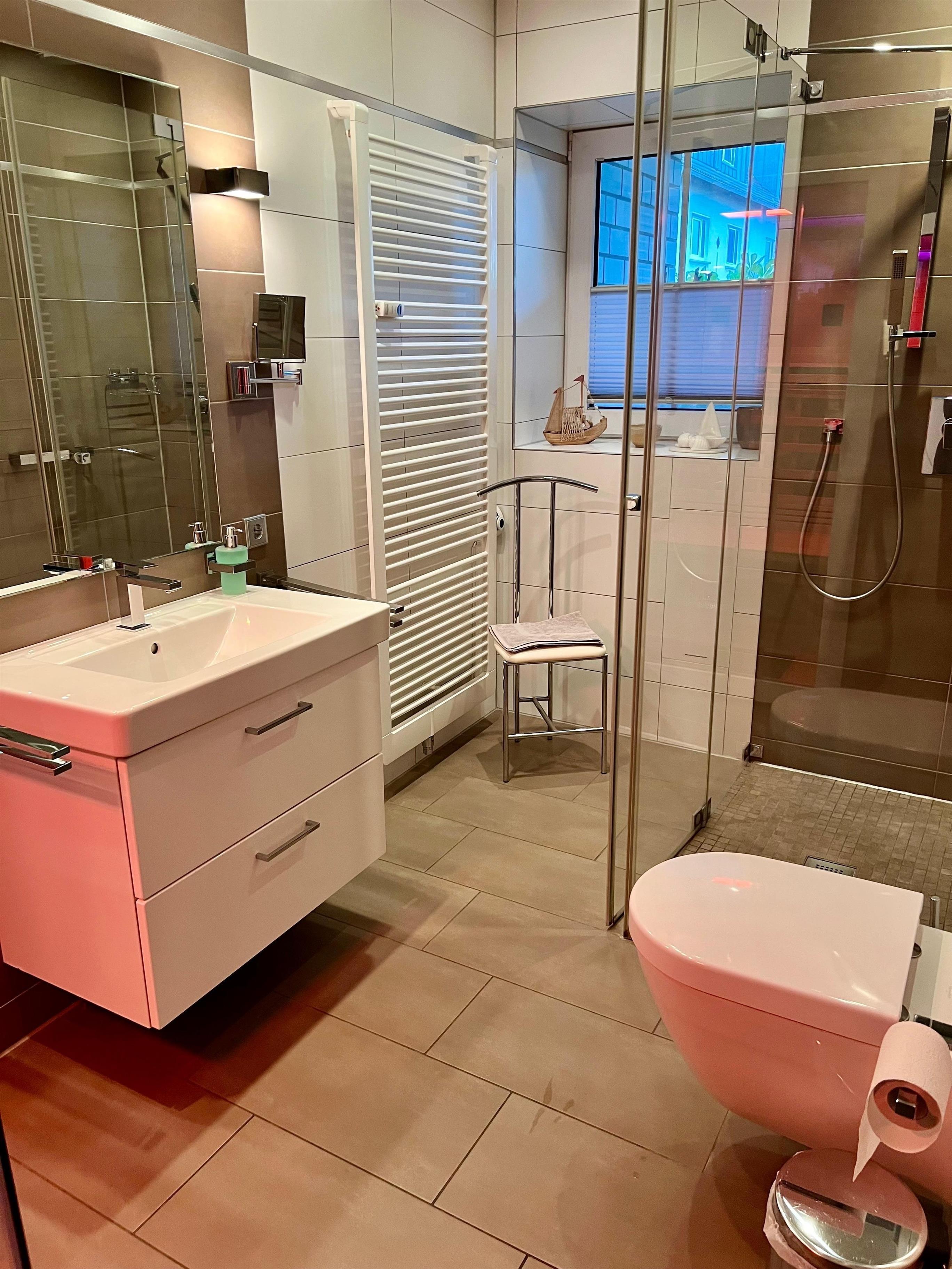 großzügiges Badezimmer mit ebenerdiger Dusche und Infrarotwärmekabine.