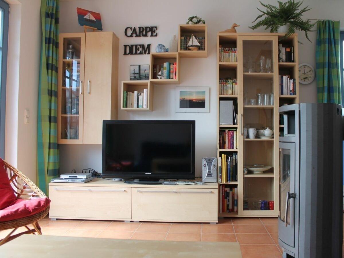 Es schließt sich ein großzügiger Wohnbereich (Flachbild-TV, DVD-und CD-Player) an mit integrierter Küchenzeile (mit Geschirrspüler, Mikrowelle und diversen Elektrokleingeräten) Für kühlere Tage gibt es im Wohnraum einen Kaminofen. Das ganze Haus wird durch eine Fußbodenheizung beheizt. Im Obergeschoss gibt es zwei Schlafzimmer und ein zweites Bad mit Dusche, WC und Waschmaschine. Im ausgebauten Spitzboden stehen zwei Einzelbetten (für Kinder) bereit, so dass insgesamt 6 Personen im Haus Platz finden. Im ganzen Haus steht Ihnen WLAN zur Verfügung.