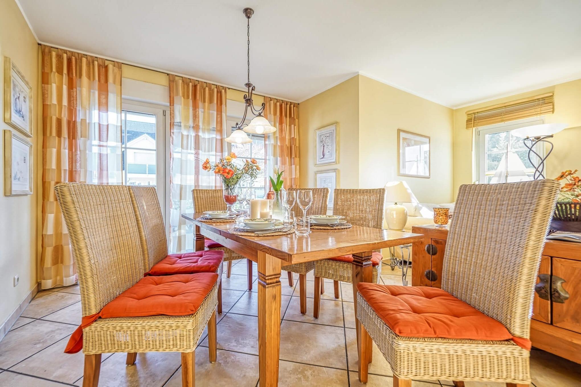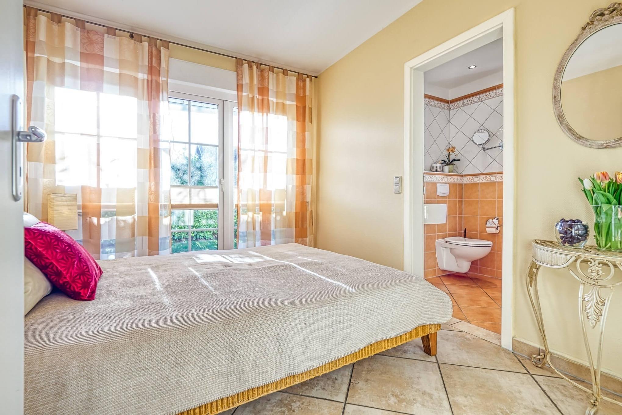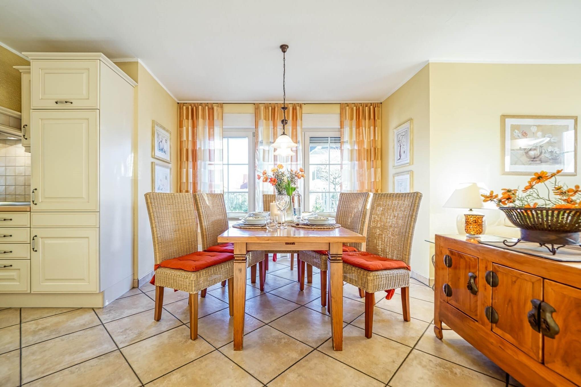 Die 90m²-Wohnung ist im mediterranen Stil geschmackvoll eingerichtet. Die Ferienwohnung erstreckt sich barrierefrei über das gesamte Erdgeschoss des Hauses.