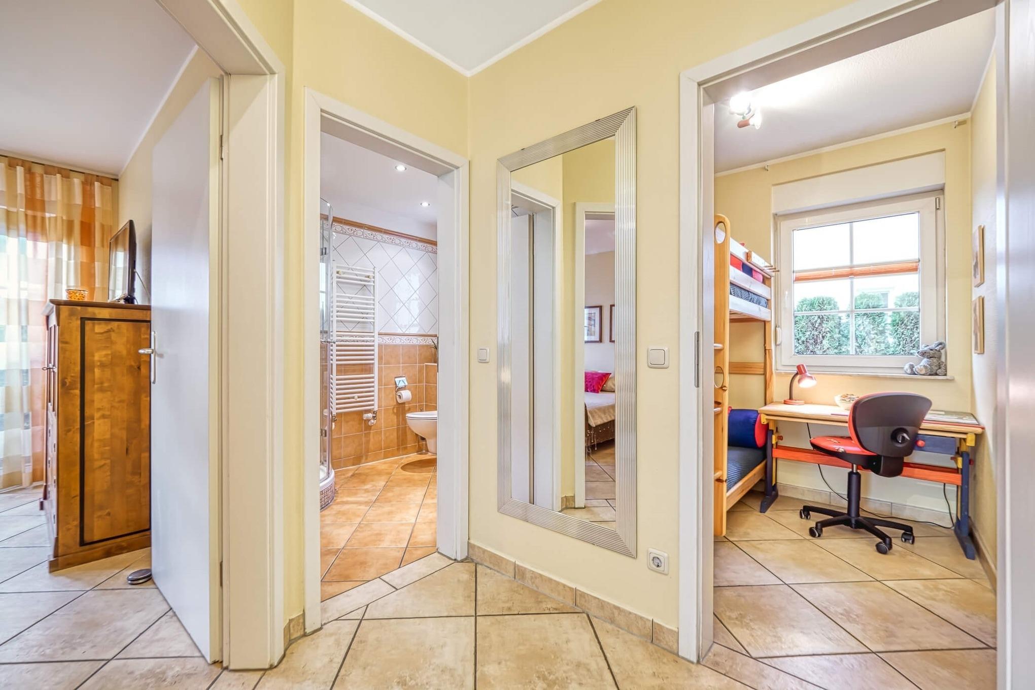 Von einem der drei Schlafzimmer zweigt direkt das Duschbad mit WC ab. Zwei Schlafzimmer sind mit einem Doppelbett ausgestattet, das Kinderzimmer hat ein Etagenbett. Die Wohnung verfügt über ein zweites Duschbad mit WC. Im Flur vor den Schlafzimmern lassen sich Garderobe und Reisegepäck in einem Abstellraum verstauen.