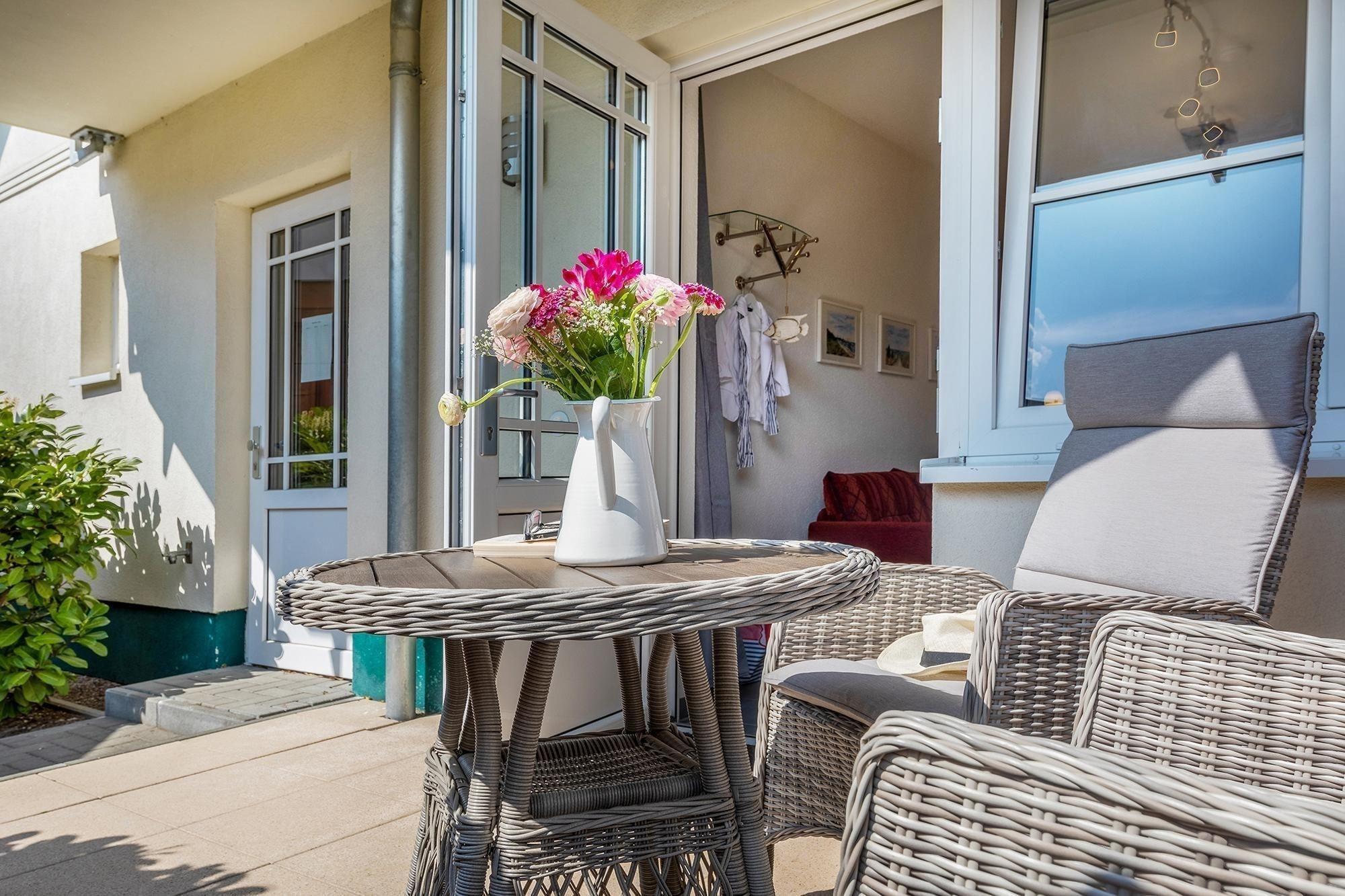 Die Ferienwohnung bietet einen einladenden Außenbereich, der mit einer gemütlichen Terrasse ausgestattet ist. Hier kann man die frische Luft genießen und entspannte Stunden verbringen. Der private Rückzugsort lädt zum Verweilen ein und eignet sich hervorragend für gesellige Abende oder ruhige Momente in der Natur. Ein idealer Platz für Erholung und Erlebnisse im Freien.