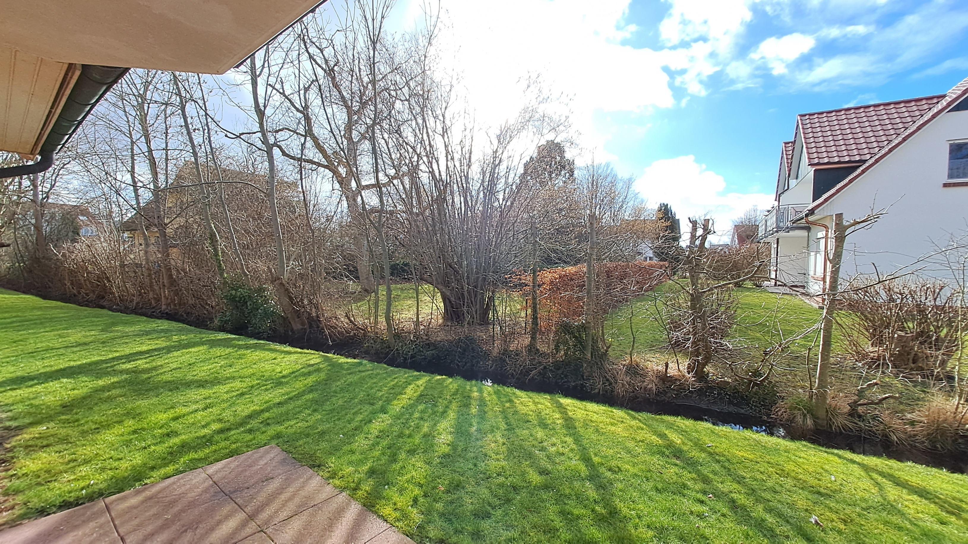 Möblierte und teils überdachte West-Terrasse mit kleiner Grünfläche davor.