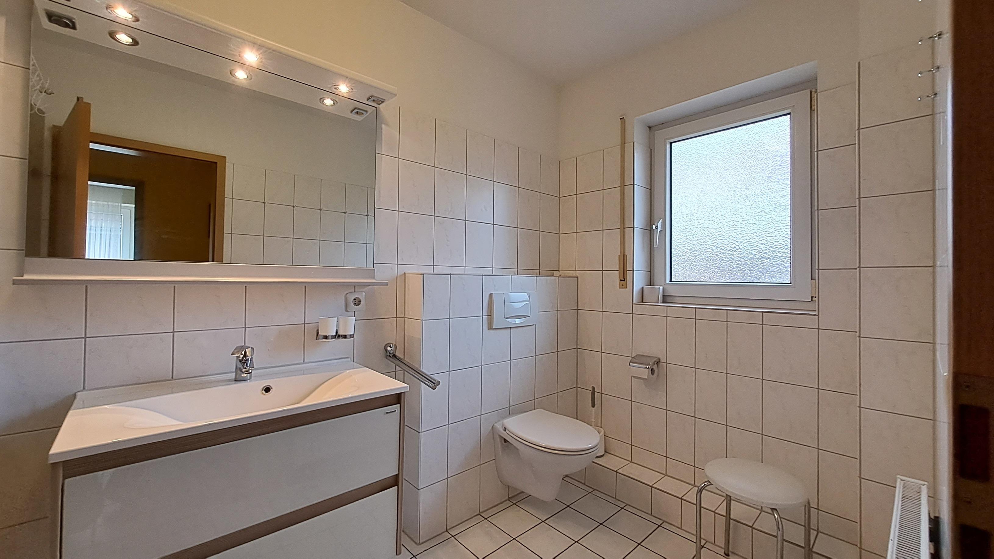 - Bodentiefe Dusche mit Glaswand sowie Waschtisch mit Spiegelschrank