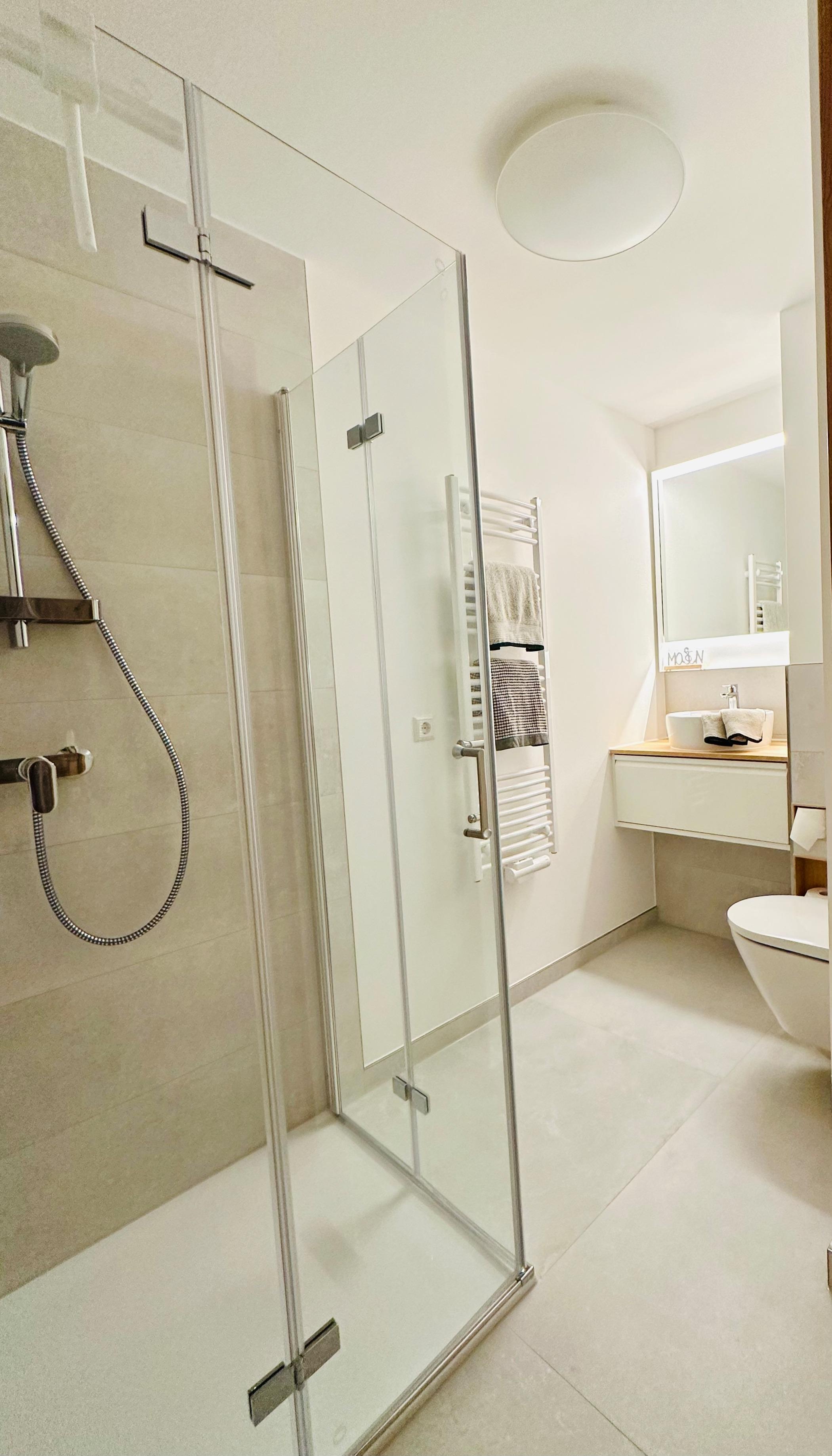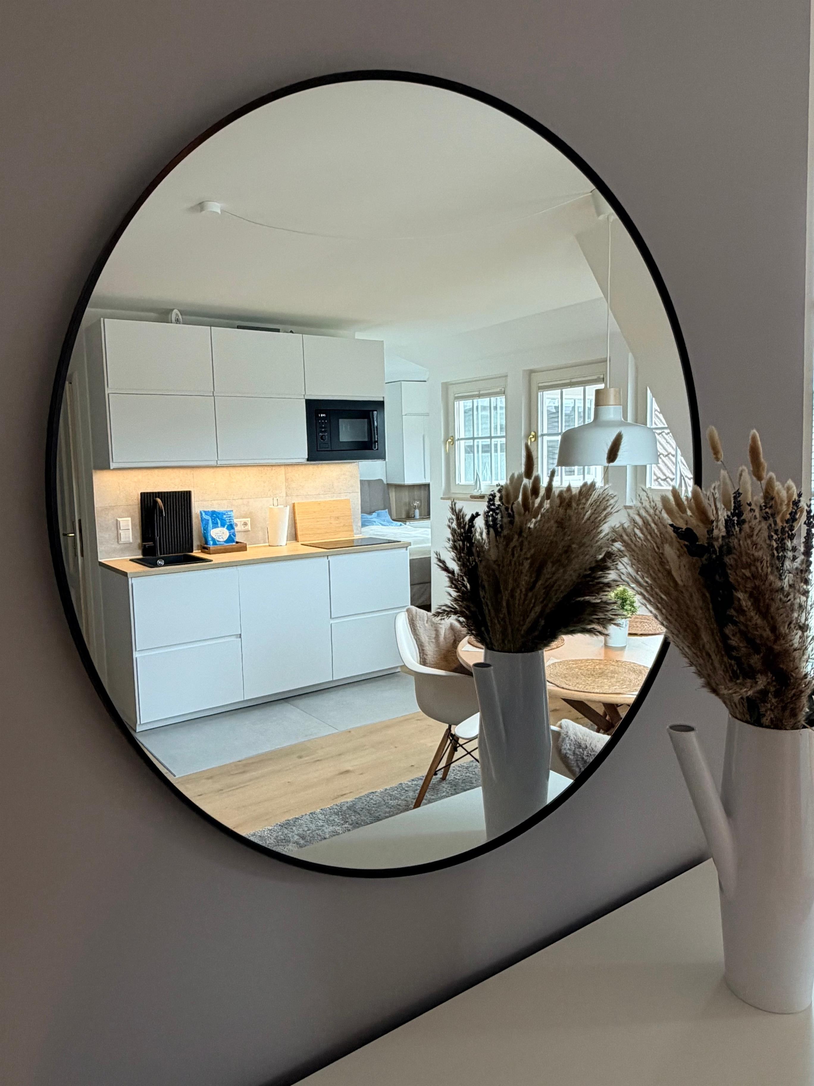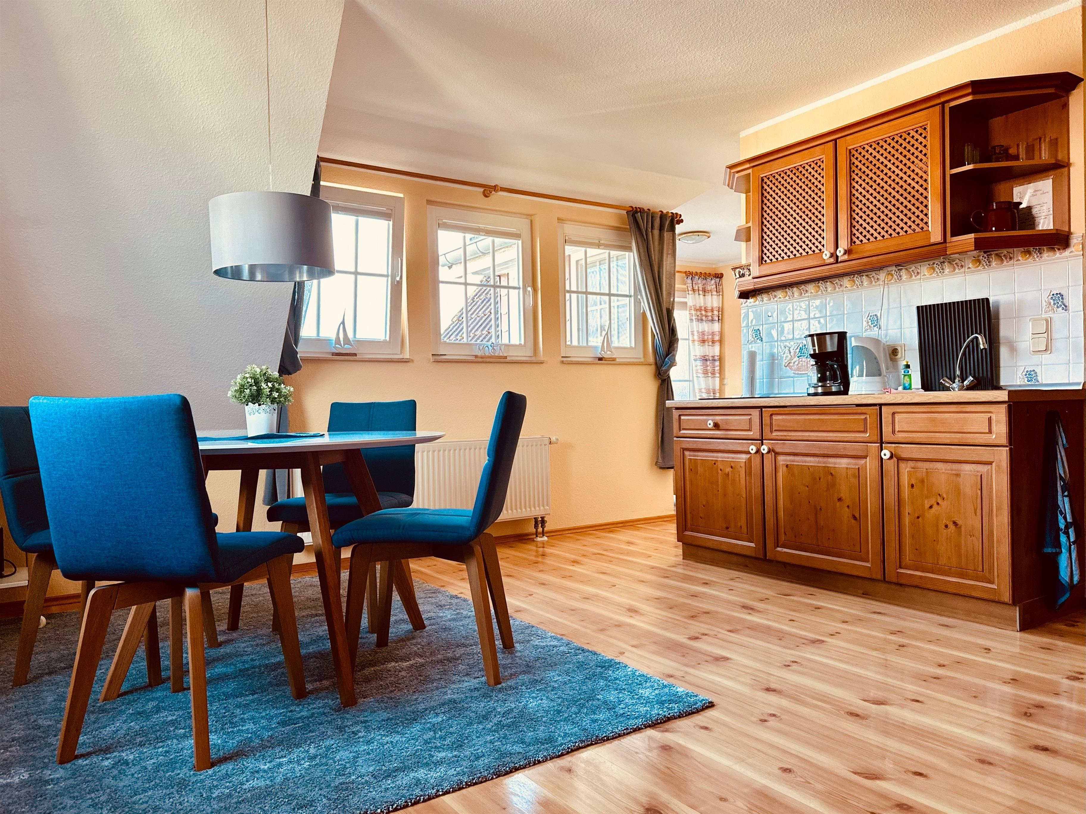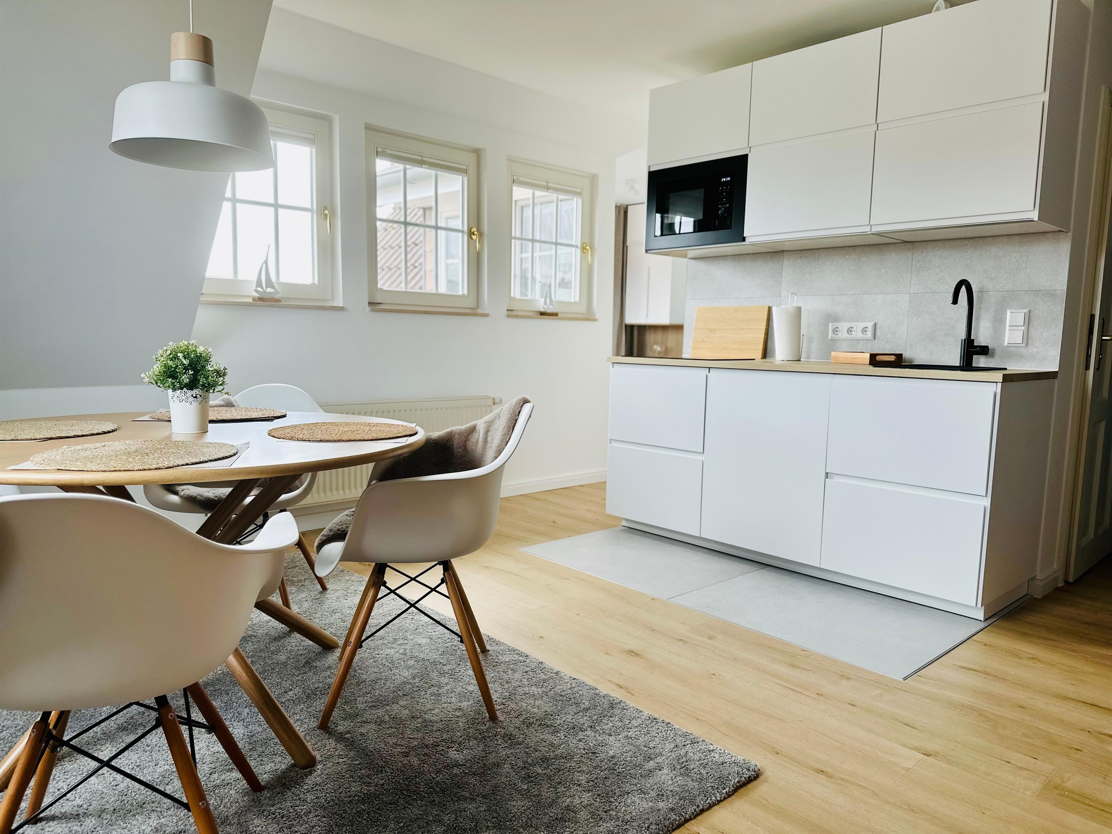 Auf 42 Quadratmetern bietet sie alles, was Sie für einen erholsamen Aufenthalt benötigen. Genießen Sie Ihre Lieblingssendungen mit SAT-TV und Radio oder bereiten Sie sich in der Küchenzeile köstliche Mahlzeiten zu. Der Schlafbereich ist mit einem komfortablen Boxspringbett mit durchgehender Matratze ausgestattet, um erholsame Nächte zu garantieren. Das frisch sanierte Badezimmer verfügt über eine kuschelige Fußbodenheizung, eine entspannende Dusche und ein WC. Eine Kammer bietet Platz für Schuhe und andere Utensilien.