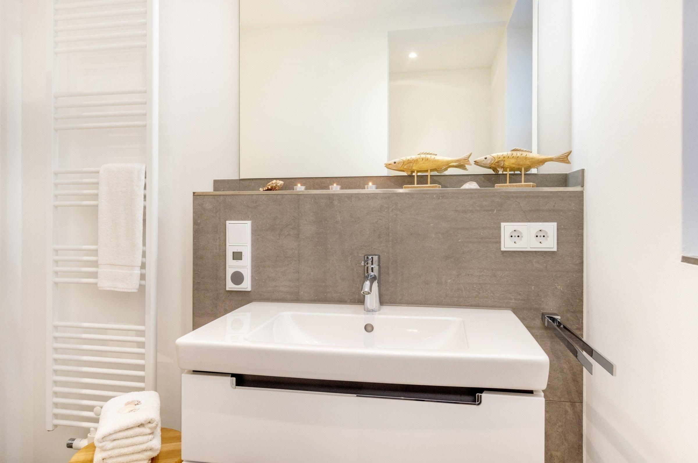 Die Ferienwohnung bietet eine freundliche und moderne Atmosphäre, ideal für einen unvergesslichen Aufenthalt. Sie umfasst zwei Schlafzimmer, die mit einem Doppelbett und zwei Einzelbetten ausgestattet sind, sowie ein Badezimmer mit bodengleicher Dusche und Fenster. Die offene Küche überzeugt durch ihre umfassende Ausstattung, inklusive Geschirrspüler, Elektro-/Gasherd, Backofen, Mikrowelle, Kühlschrank und Kaffeemaschine. Ein komfortabler Esstisch lädt zu gemeinsamen Mahlzeiten ein. Der großzügige Wohnbereich mit Kamin/Kachelofen und HiFi-Anlage sorgt für entspannte Abende. Die Wohnung ist allergikergeeignet und bietet zahlreiche Annehmlichkeiten wie WLAN, Waschmaschine, Haartrockner und Bügeleisen. Ein Parkplatz ist ebenfalls vorhanden, und ein Starterset mit Gewürzen sorgt für kulinarische Freude. Zudem stehen Brettspiele für unterhaltsame Stunden bereit. Die Ferienwohnung ist der perfekte Rückzugsort für Familien und Paare, die Ruhe und Komfort suchen.