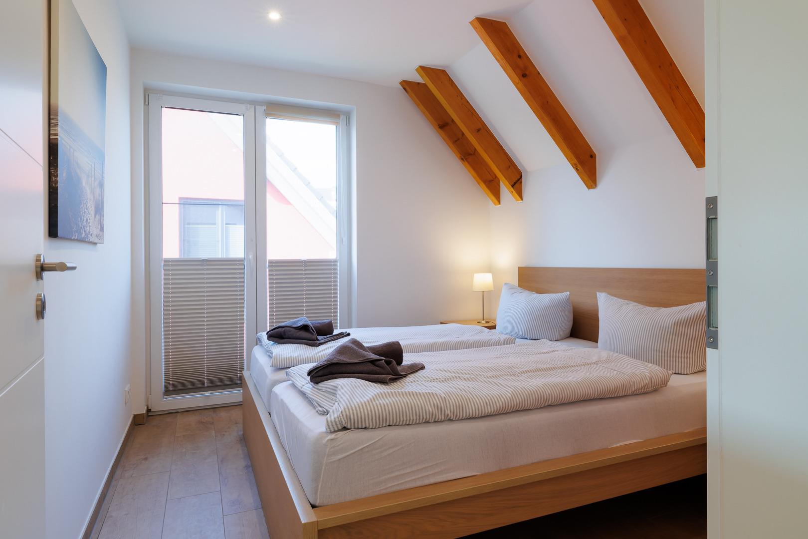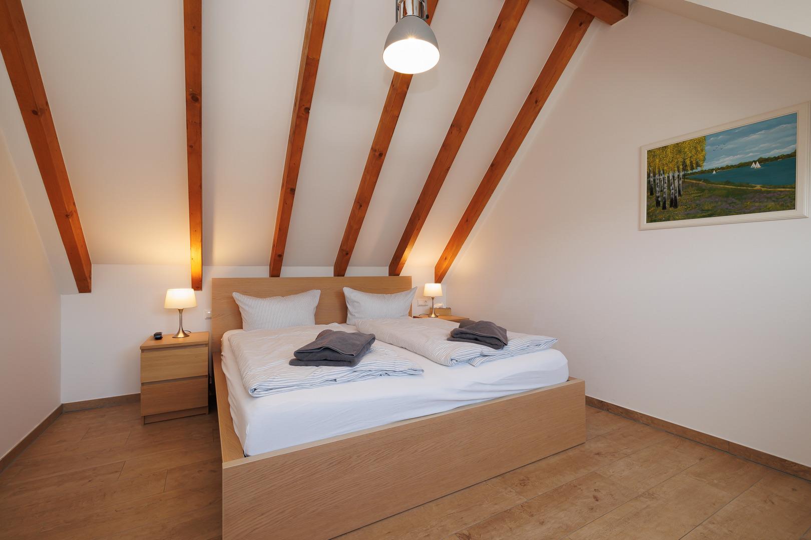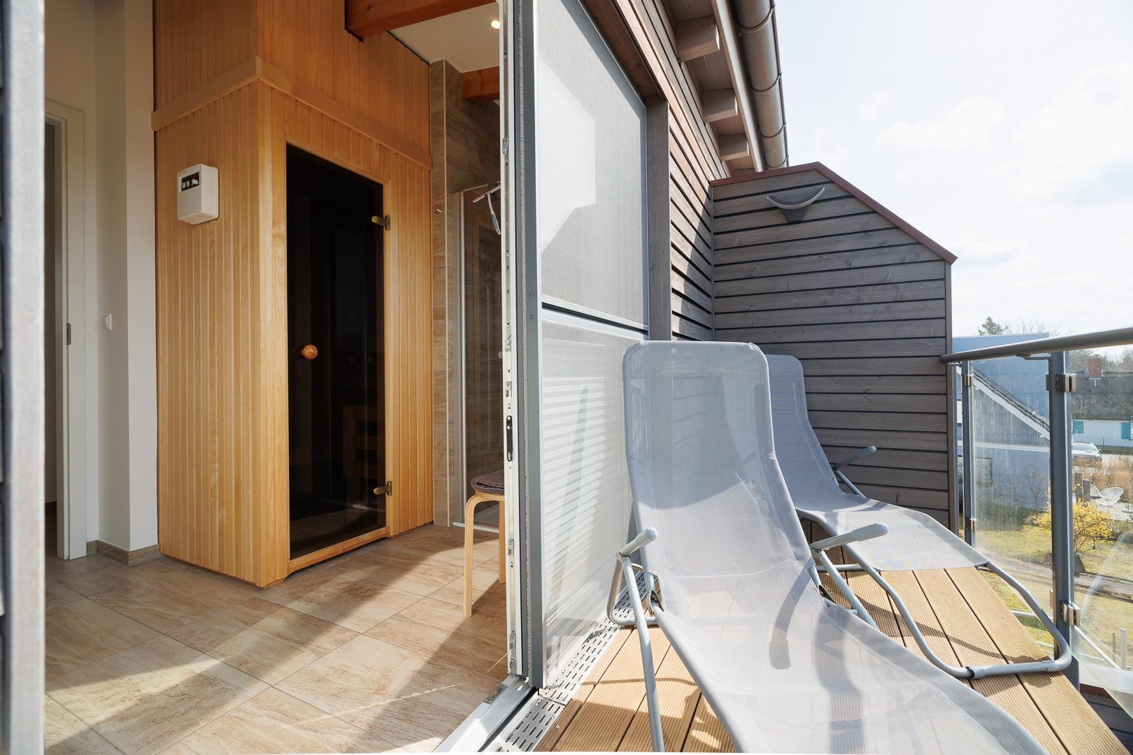 Im Dachgeschoß ist das 2. Schlafzimmer mit Doppelbett 180x200cm ( 2. Etage), ein weiteres Badezimmer mit bodengleicher Dusche (mit getrenntem WC) und die eigene Sauna mit Zugang zum 2. Balkon untergebracht.