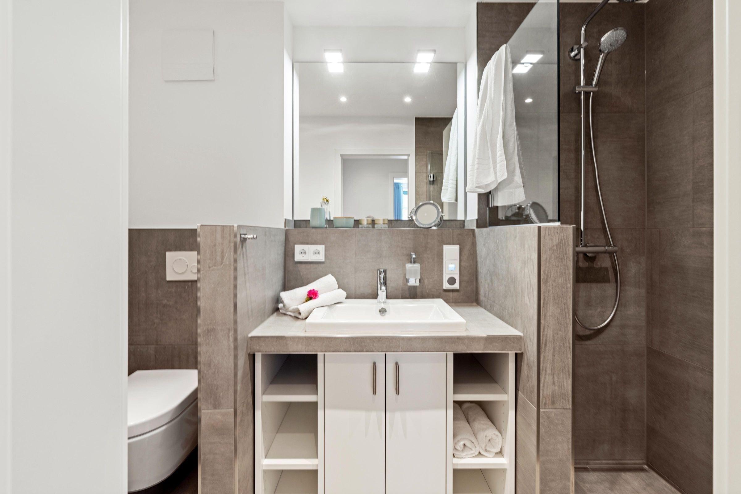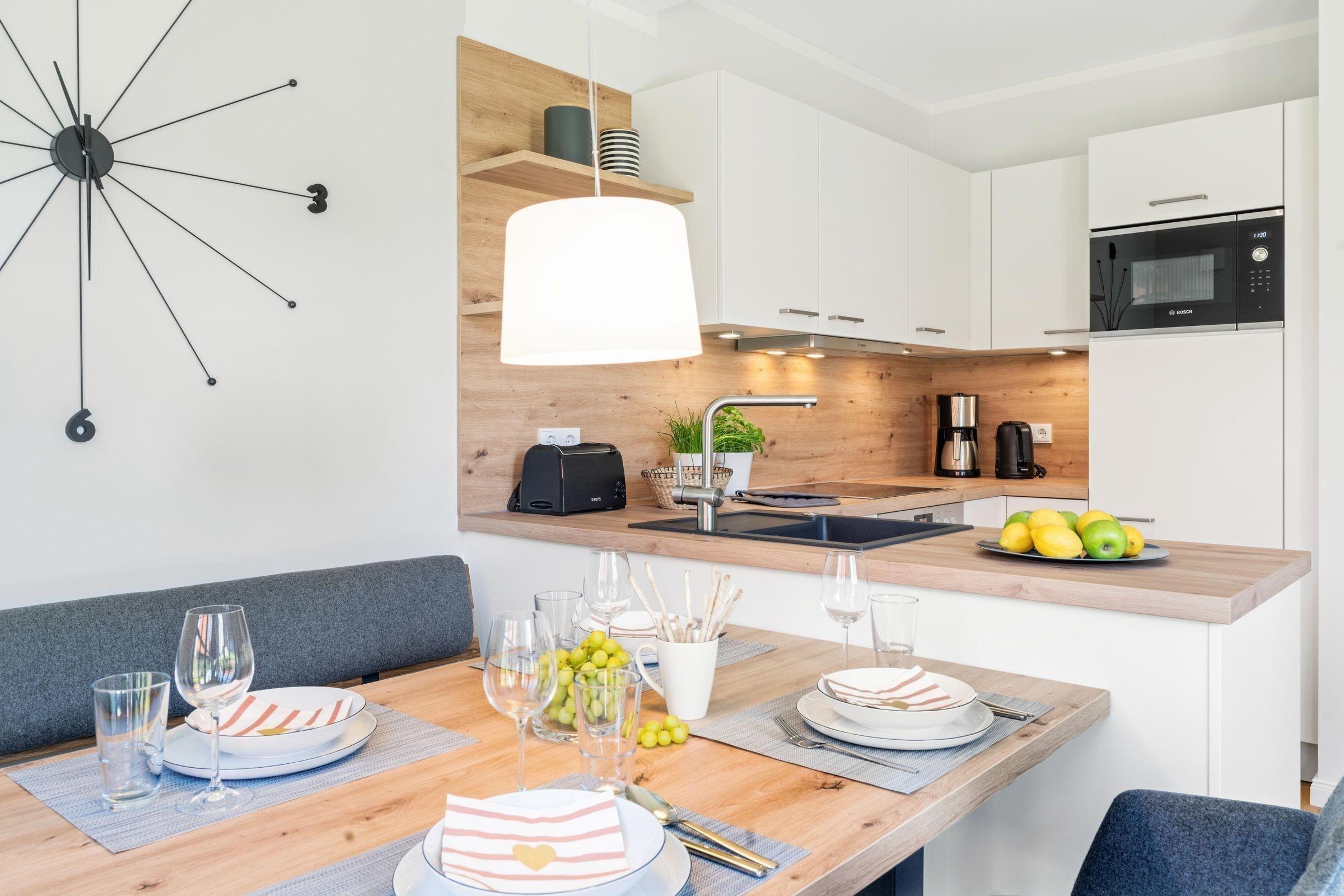 Die Ferienwohnung zeichnet sich durch eine moderne und großzügige Raumgestaltung aus, die sowohl Komfort als auch Funktionalität bietet. In der offenen Küche findet sich eine umfassende Ausstattung, darunter Geschirrspüler, Elektro-/Gasherd, Backofen, Mikrowelle, Kühlschrank sowie eine Kaffeemaschine. Die beiden Schlafzimmer verfügen über ein Doppelbett und zwei Einzelbetten, die für einen erholsamen Schlaf sorgen. Das Badezimmer ist mit einer bodengleichen Dusche und einem Haartrockner ausgestattet.